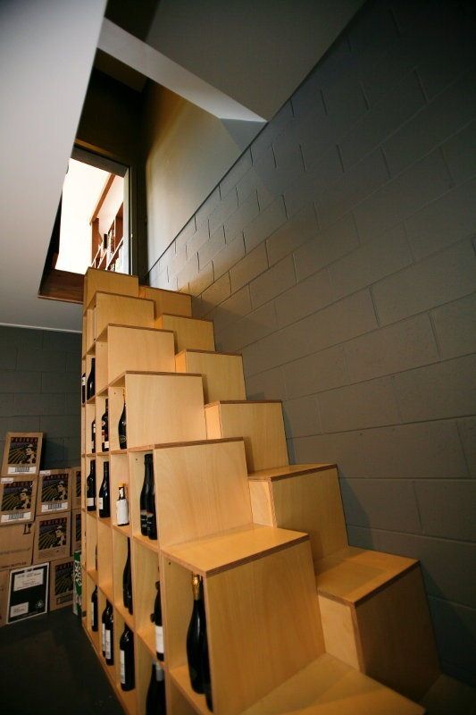 Daca aveti o pivnita, iata o idee foarte practica: scari cu stocare pentru sticlele de vin. Ideea de baza este foarte simpla: cuburi din lemn asezate in forma de scari, deschise pe o parte pentru a putea accesa usor sticlele.