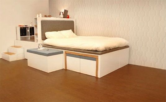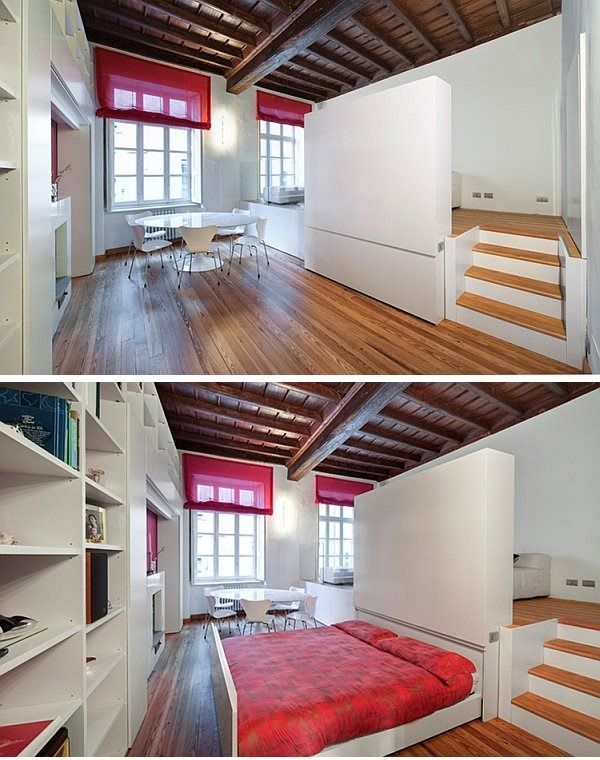 O alta idee interesanta este de a avea podea inaltata si dedesubt instalat un pat pentru dormit. Seara se poate trage in exterior pentru a oferi un somn confortabil.