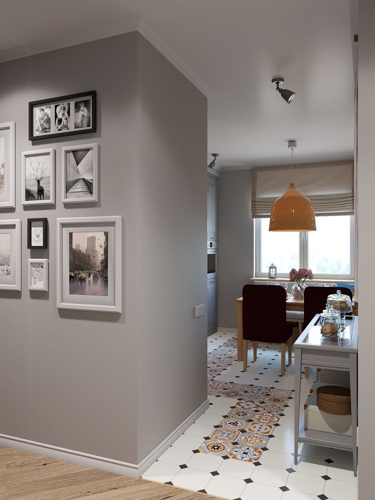 Vei recunoaste probabil stilul nordic in aceasta amenajare, prin cromatica neutra, cu tuse de culoare discret inserate; placile decorative de la nivelul pardoselii din bucatarie, alaturi de scaune, corp de iluminat si perne decorative inveselesc decorul.