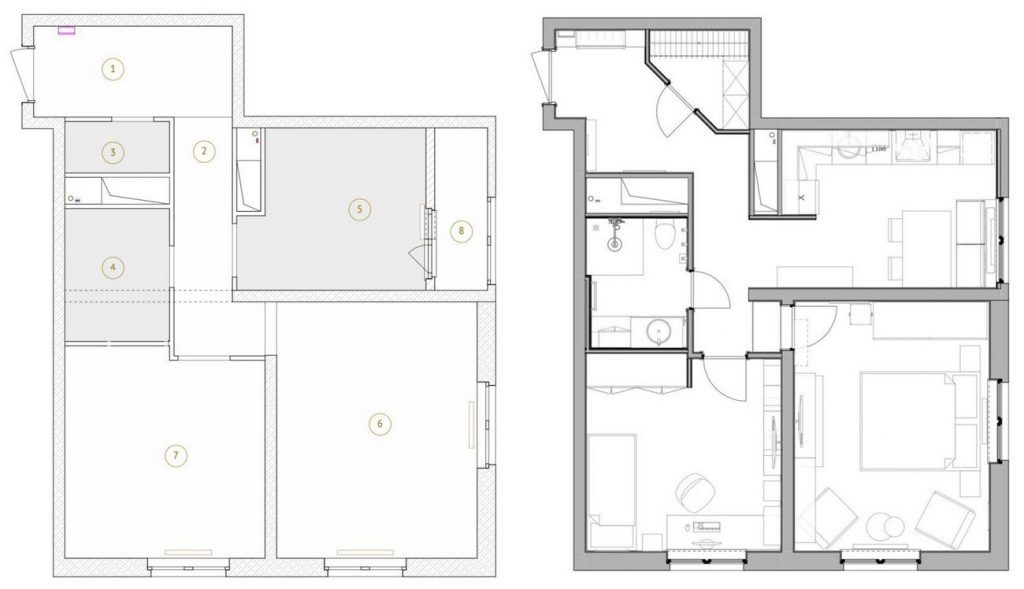Pe langa aceste reconfigurari, un alt aspect notabil a fost renuntarea la conceptul de living transformat in camera-dormitor; zona de zi s-a limitat astfel doar la perimetrul bucatariei. Prin marirea suprafetei si eliminarea usii, s-a putut contura o zona placuta cu loc de luat masa, dar si spatiu pentru gatit si depozitat cu toate cele necesare. Impreuna cu designerul au gasit solutiile optime; o mare parte din mobilier si accesorii au fost achizitionate din IKEA. Astfel, au reusit sa inchege un concept unitar, simplu, practic si cu bun-gust.