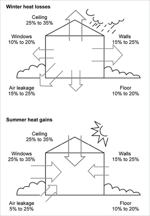 Schema care arata pierderile si absorbtiile de caldura suferite de o constructie in timpul iernii respectiv verii.