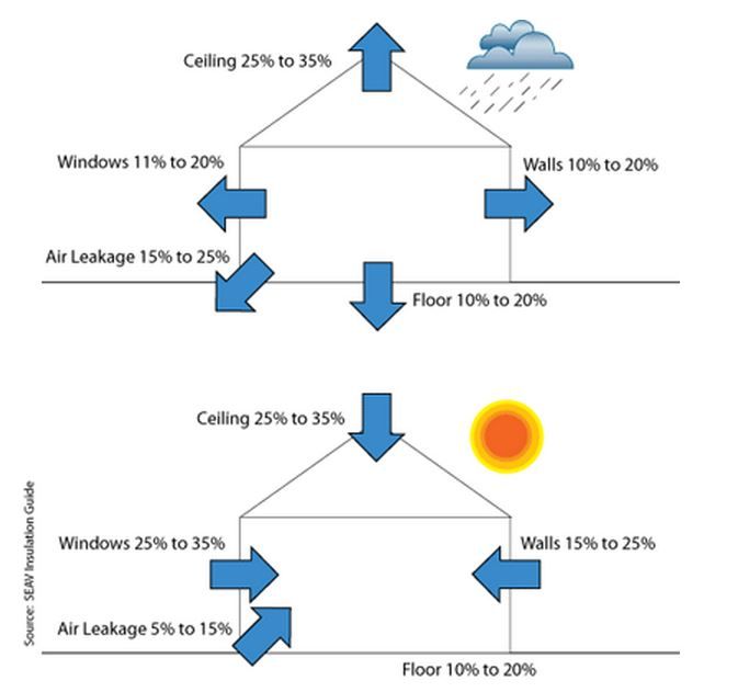 Schema care arata pierderile si absorbtiile de caldura suferite de o constructie in timpul iernii respectiv verii.