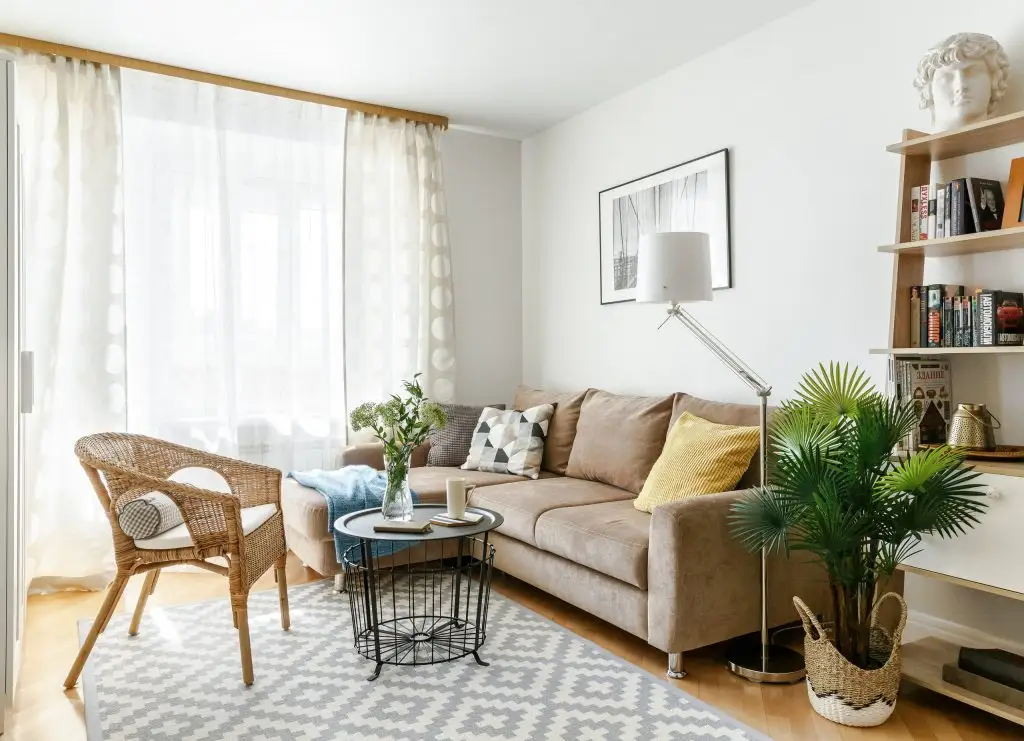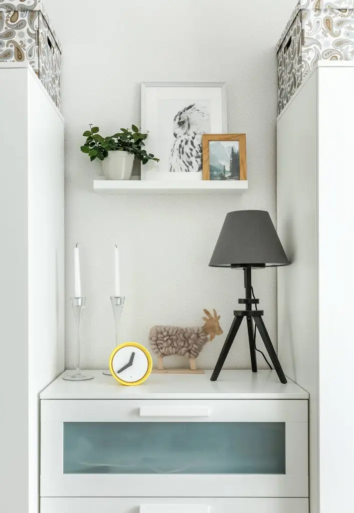 Living-ul, de mici dimensiuni, are in alcatuirea sa un coltar extensibil, o masa de cafea moderna, o comoda si un dressing, ambele din urma cu design minimalist. Nuantele predominante sunt alb-ul imaculat si culorile caracteristice stilului scandinav.