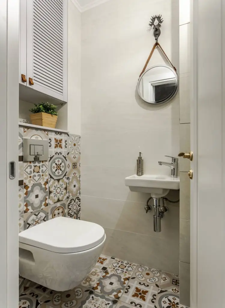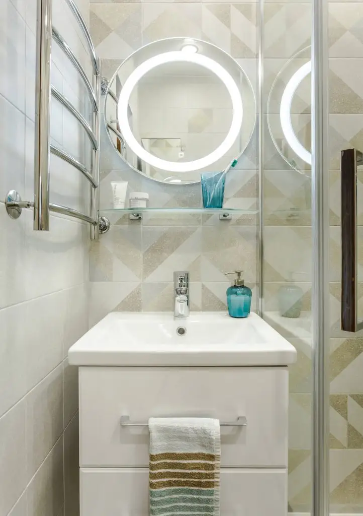 In spatiul baii se imbina armonios texturi diferite. Avem de o parte linii perfect geometrice si de cealalta o abstractizare a acestora transpusa intr-un mod modern fara a fi nevoie de o trasare liniara precisa. Punctul de atractie este oglinda rotunda incastrata care vine insotita de un led propriu pentru o iluminare mai precisa.