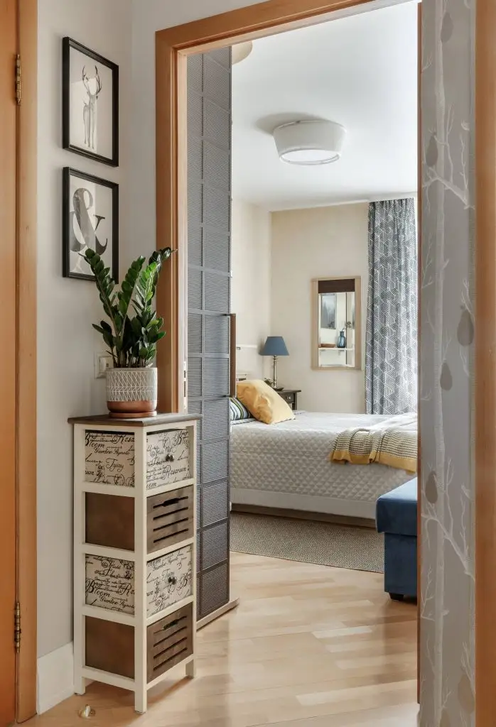 Dormitorul aduce in prim plan o imbinare de texturi in ceea ce priveste accesorizarea textila si pastreaza linia scandinava din incaperea alaturata. Mobilierul este practic si compactat si, cu un design “pe colt”, acesta vine simetric in continuarea tuturor celorlalte elemente.