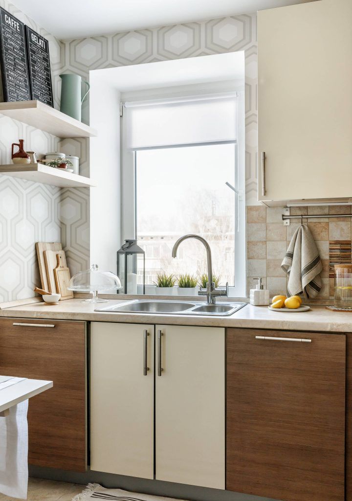 Nuantele mobilierului, design-ul acestuia si pattern-urile murale, ne duc cu gandul catre o amenajare cu accente vintage atunci cand vorbim de zona de servire a mesei. Bucataria, desi ne pune la dispozitie un spatiu restrans, se structureaza in mod functional si permite desfasurarea intr-o maniera corecta a pregatirii mesei si servirii acesteia.