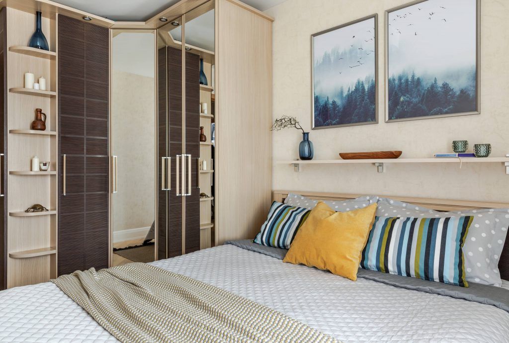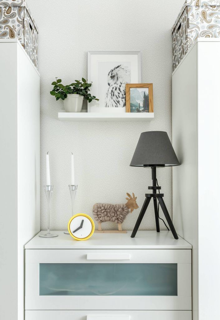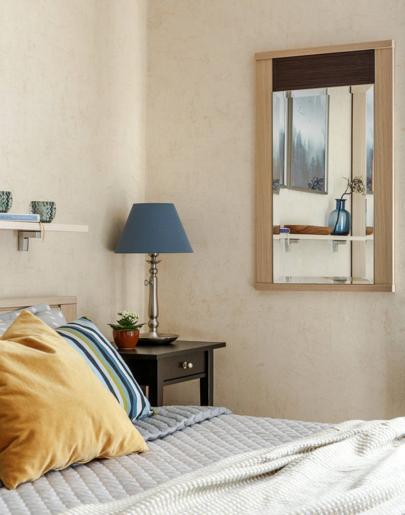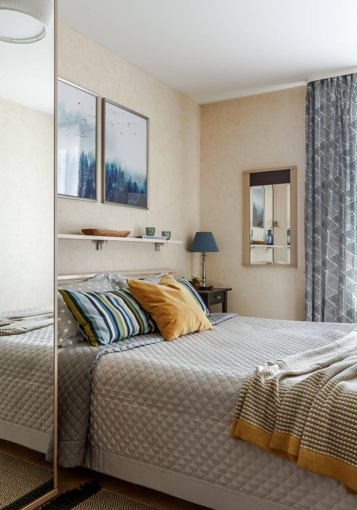 Dormitorul aduce in prim plan o imbinare de texturi in ceea ce priveste accesorizarea textila si pastreaza linia scandinava din incaperea alaturata. Mobilierul este practic si compactat si, cu un design “pe colt”, acesta vine simetric in continuarea tuturor celorlalte elemente.
