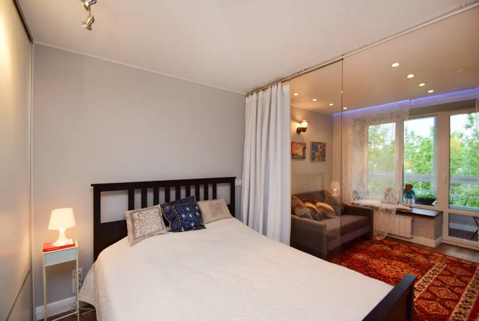 Amenajarea a fost gandita intr-un stil actual, cu accent pe functionalitate si pe conturarea zonelor dorite de beneficiari. Astfel, in spatiul camerei, a fost introdusa o partitie din sticla care marcheaza zona de dormit. Pentru un plus de intimitate, tot spatiul din jurul patului poate fi ascuns in spatele unei draperii groase.