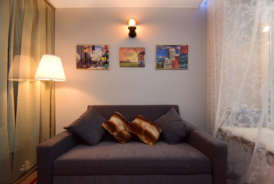 De cealalta parte a paravanului, a fost gandit un spatiu de zi, cu o sofa, lampadar si cateva tablouri menite sa invioreze decorul. Pentru un plus de confort, designerii au marit suprafata ocupata de fereastra si au conturat in dreptul balconului tip logie, un spatiu de sezut, amenajat cu o banca.