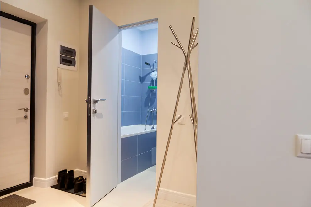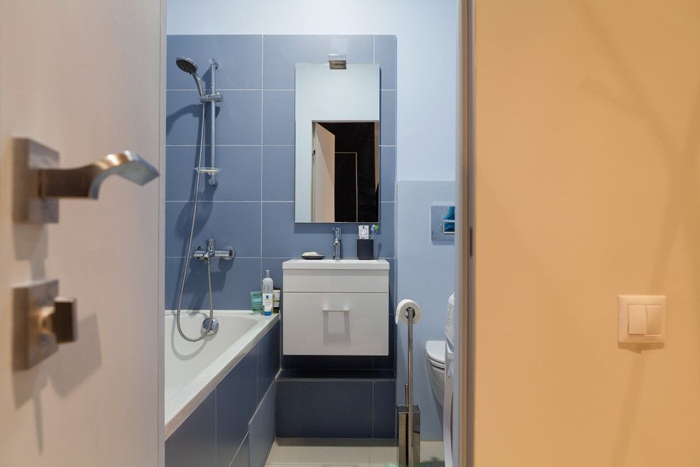 Acolo unde lipseste lumina naturala este necesara o compensare. De aceea, in spatiul holului s-a optat pentru alb si crem, de la tavan, la pereti, plinte, usi si pardoseala. In baie, se reia tematica culorilor, de data aceasta cu un albastru mult mai potolit, o nuanta blanda, mai deschisa, potrivita pentru un astfel de spatiu.