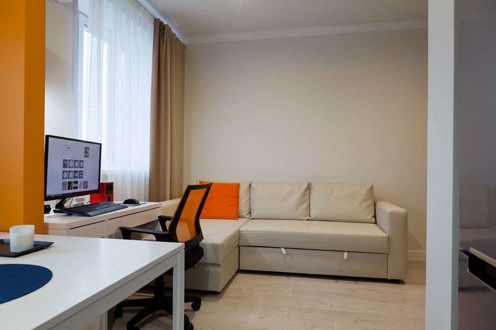 Canapeaua este extensibila pentru a se transforma in zona de dormit pe timpul noptii. Imediat langa s-a putut integra si un birou. Mica parte din peretele despartitor joaca rol delimitator intre camera si locul de luat masa din bucatarie.