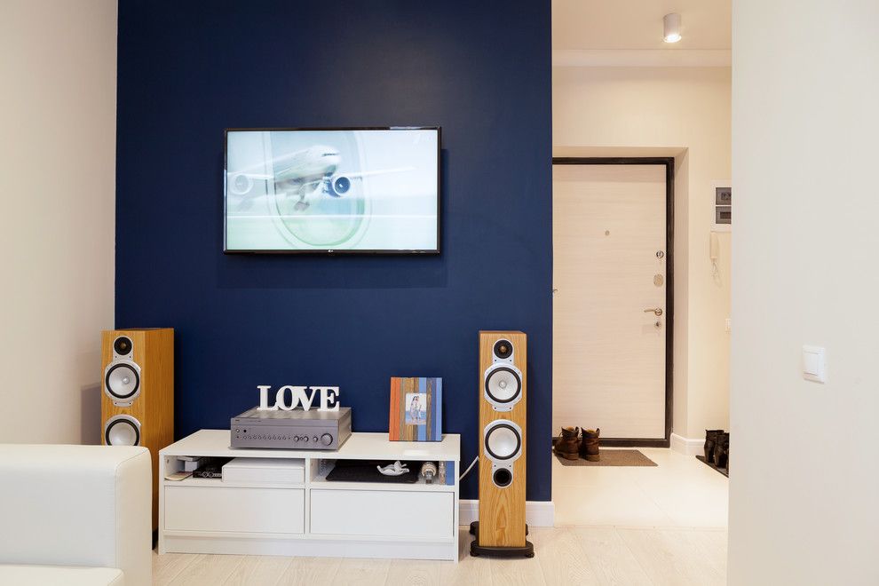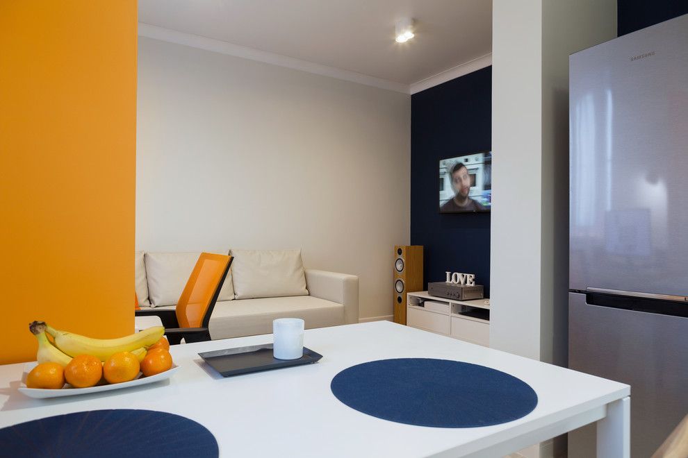 Limitarile spatiului au condus la o linie minimala a amenajarii, cu mobilier putin, doar strictul necesar. Pentru a nu ramane in zona banalului, designerul a mizat pe culori cu care a animat intreg decorul. De exemplu, a conturat o zona-accent cu un albastru saturat pe peretele cu televizorul. Apoi, partitia care aminteste de fostul perete ce separa camera de bucatarie a fost zugravita cu portocaliu. Aceeasi culoare s-a folosit si pentru usa dressingului, iar albastrul mai apare si in bucatarie, de o parte si cealalta a mobilierului. In rest, totul este echilibrat cu alb, crem si finisaje lucioase pentru a amplifica spatiul si a-i aduce un plus de luminozitate.