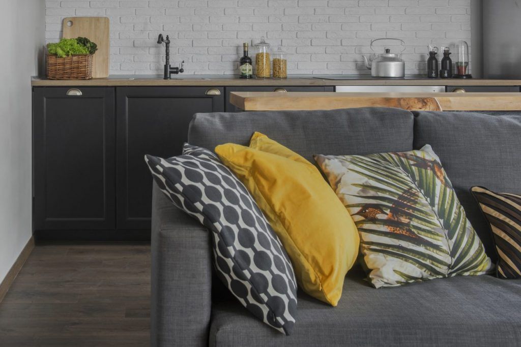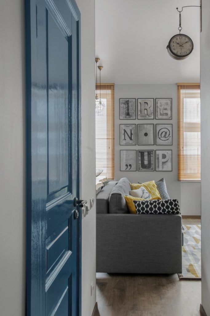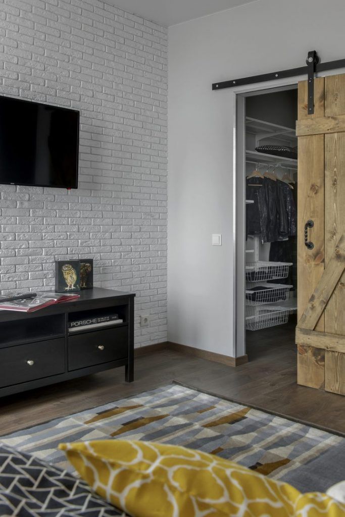 A ales o canapea confortabila si extensibila pentru a putea fi folosita ca pat pentru dormit. In nisa existenta in apartament, a amenajat un dressing incapator pentru haine si alte lucruri voluminoase. Desi, initial gandise o usa obisnuita, batanta cu care sa inchida aceasta mica incapere, a gasit intr-o revista ideea cu o veche usa de hambar, reconditionata si pusa pe sine. Cu ajutorul unui prieten tamplar a reusit sa o aduca la forma existenta si sa o monteze. Textura de lemn brut a usii aduce un plus de stil la nivelul decorului. Comoda si televizorul sunt piesele care intregesc spatiul livingului; covorul si pernele decorative in nuante de gri si galben inveselesc amenajarea.