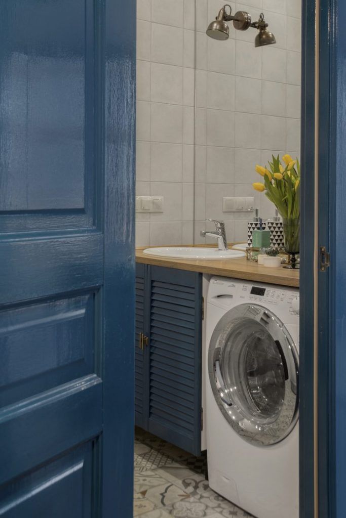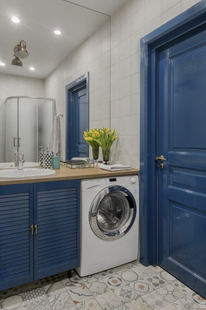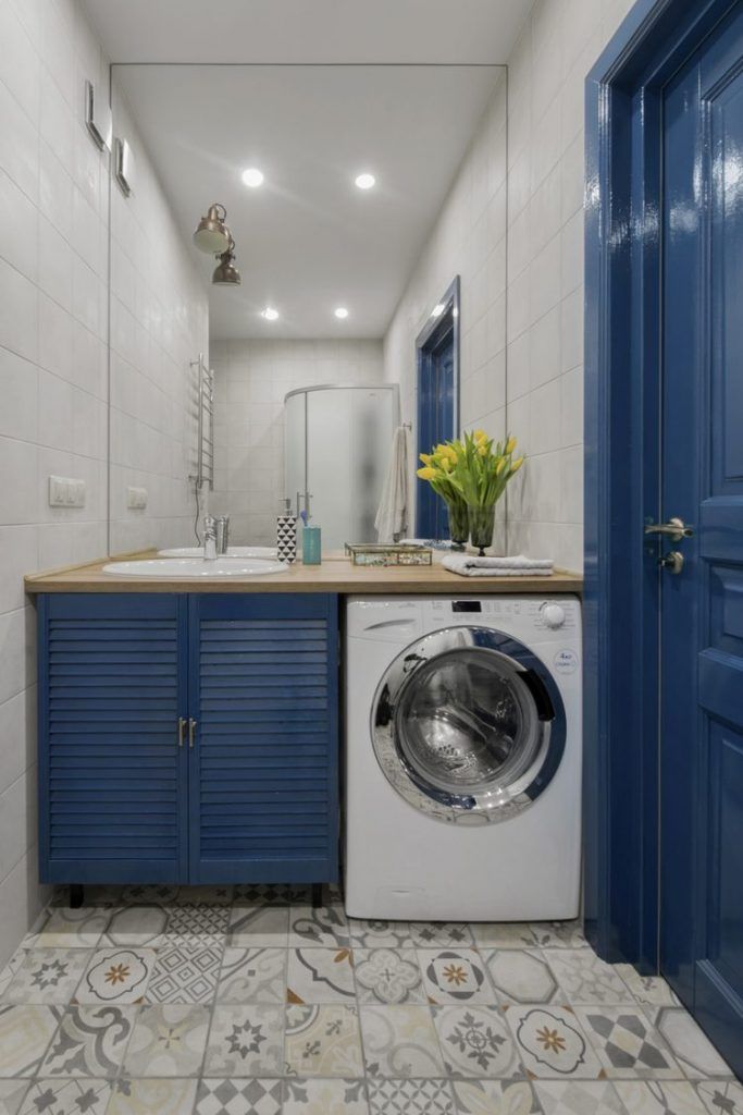 In baie, a optat pentru o abordare mai colorata, cu accente de albastru si placi decorative la nivelul pardoselii. Usa baii a fost vopsita in albastru si la fel usile tip oblon de sub lavoar. Tot aici a fost incorporata si masina de spalat rufe; oglinda supradimensionata creeaza iluzia unui spatiu mai mare, excelenta idee pentru a amplifica senzatia de spatialitate intr-o baie mica.