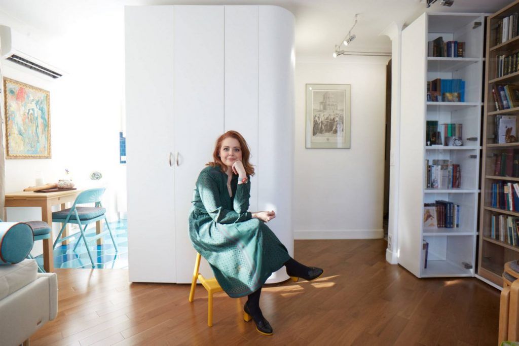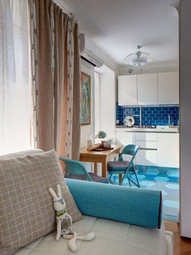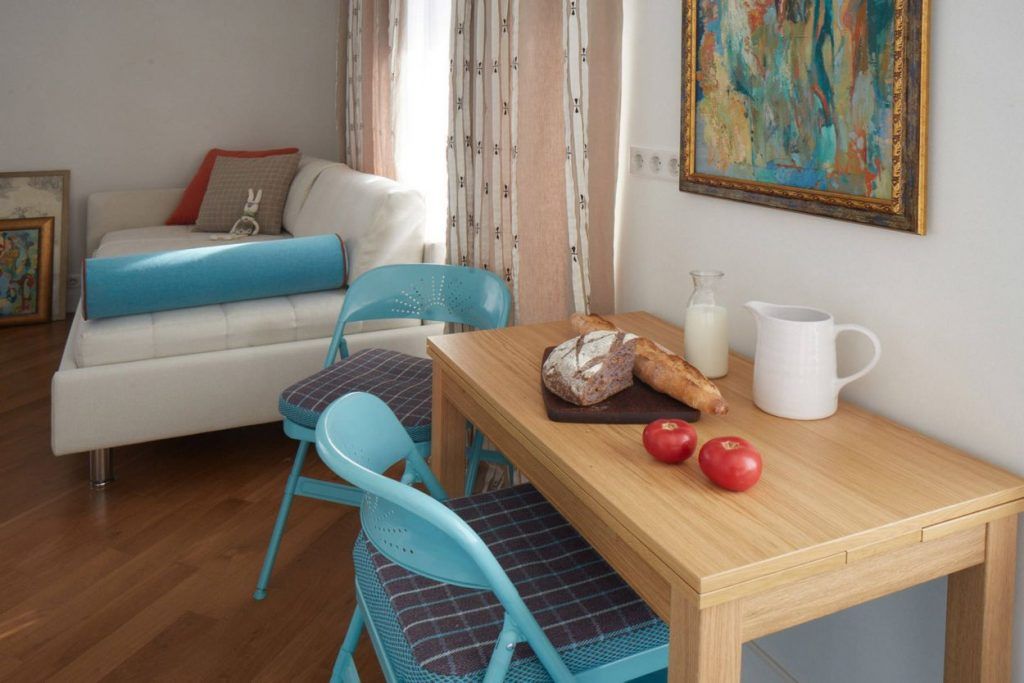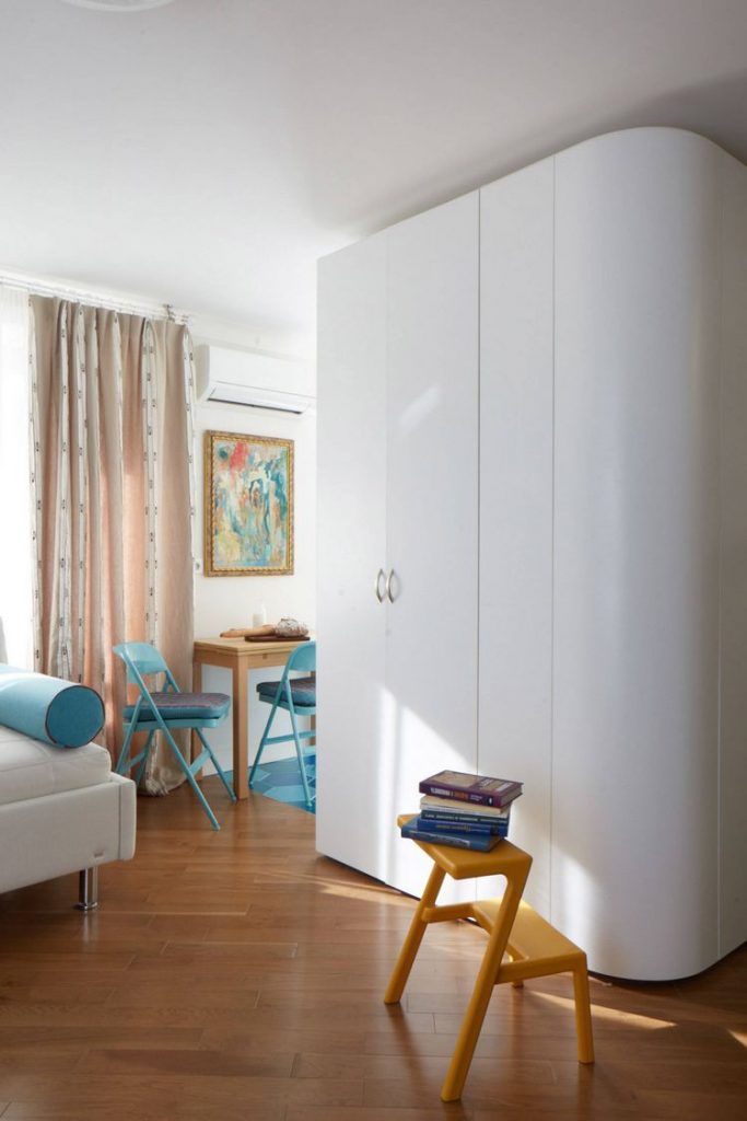 Canapeaua a fost aleasa cu atentie, fiind un model extensibil pentru a fi folosita ca loc de dormit. Principala zona de depozitare a locuintei a fost gandita si ea ingenios, sub forma unor dulapuri cu front alb, rotunjite pe latura care da inspre hol.
