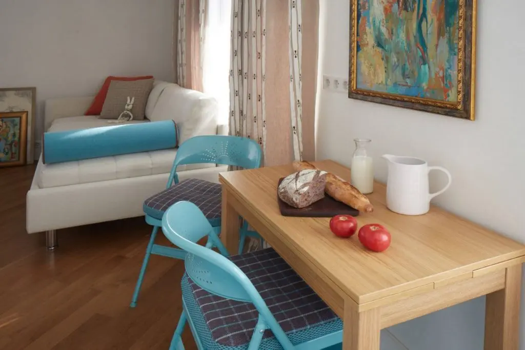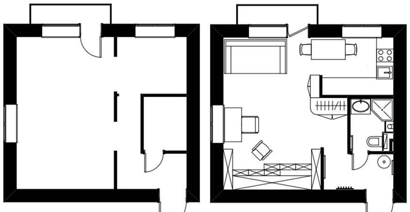 Configuratia locuintei este aceea a unui apartament cu o camera, iar bucataria de sine statatoare, dar deschisa, fapt ce a permis si amenajarea unui mic loc pentru luat masa, ca o legatura intre camera si bucatarie.