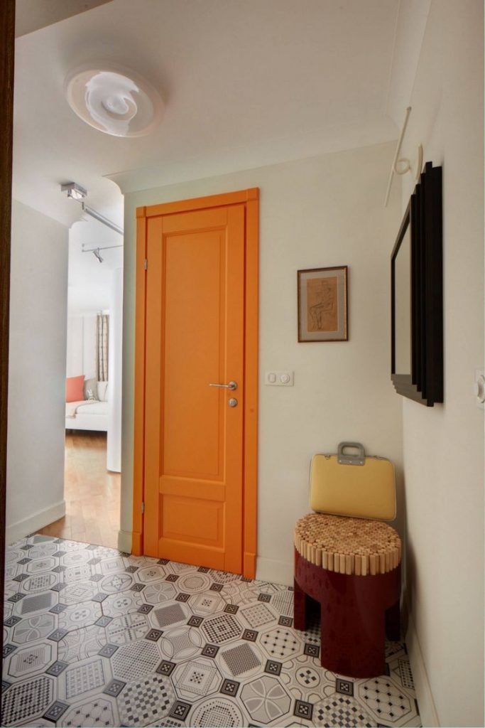 Cromatic, predomina o baza de alb, pe care au fost adaugate tuse de culori, de la albastru pana la portocaliu sau galben. In hol, ne atrage atentia modelul de gresie pentru pardoseala, iar usa de la baie portocalie, alaturi de placile mozaic de pe perete transforma spatiul din banal intr-unul cu stil.