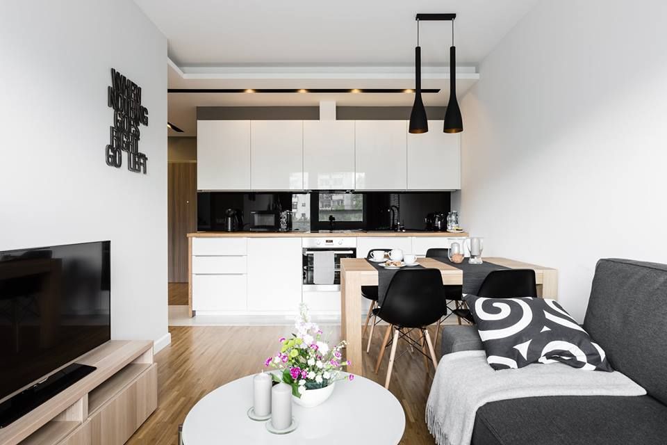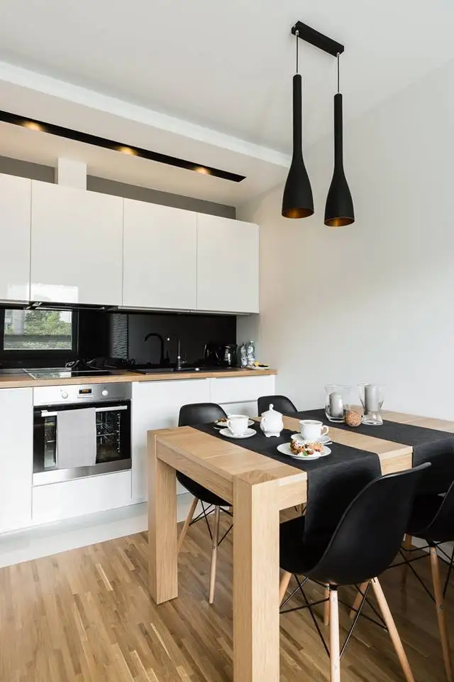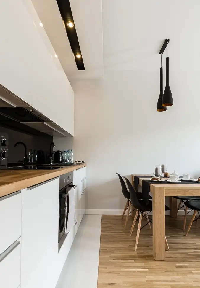 In zona destinata bucatariei, amenajarea pastreaza un caracter unitar, cu o configuratie in linie dreapta si mobilier cu un design simplu. Frontul alb-lucios reflecta lumina pentru a amplifica spatiul ingust. Insertiile de negru pe care le intalnim la nivelul bucatariei, dar si a locului de luat masa distrag parca atentia de la dimensiunile spatiului, conturand mici zone de interes.