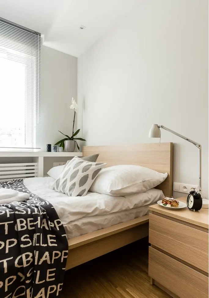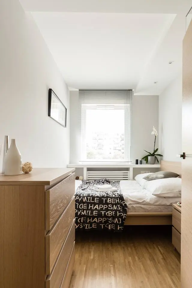 Dormitorul de 8 metri patrati urmeaza linia designului minimalist, tinand cont de dimensiunile reduse ale incaperii. Patul este asezat la fereastra, decorul fiind completat de o noptiera si o comoda cu sertare.
