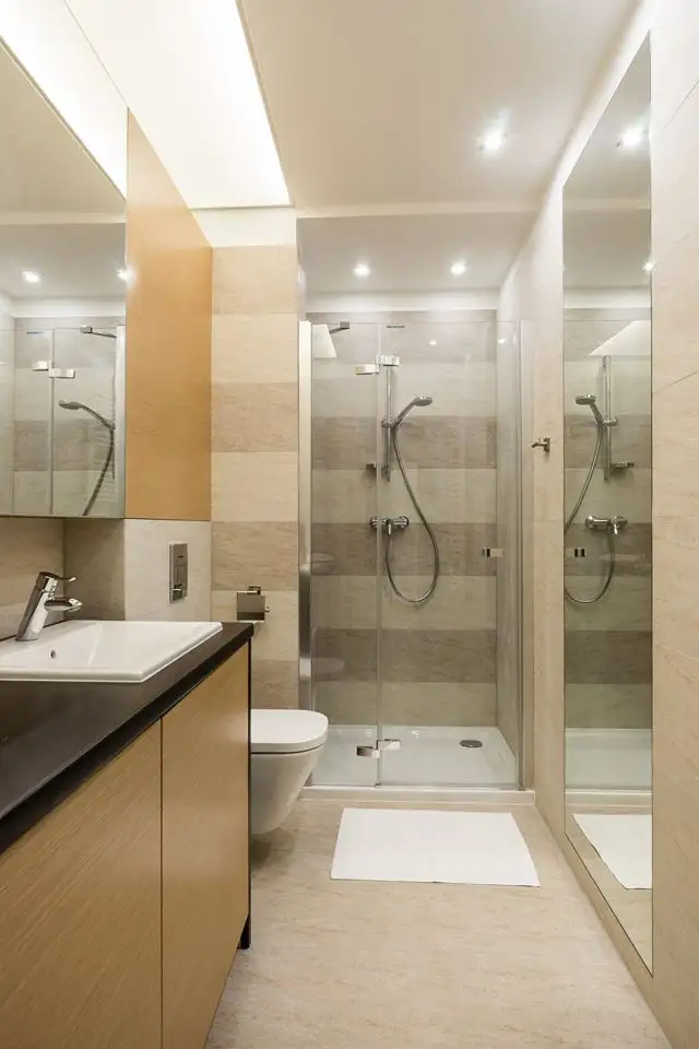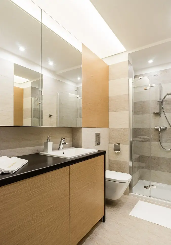 Si decorul baii pastreaza caracterul functional, ingloband noi spatii pentru depozitare, atat in partea superioara a baii cat si in cea inferioara, unde se afla si masina de spalat rufe. Jocul oglinzilor si iluminatul adecvat transforma baia si o fac sa para mai mare decat in realitate. Optiunea pentru o zona de dus in locul unei cazi este binevenita pentru ergonomia incaperii.