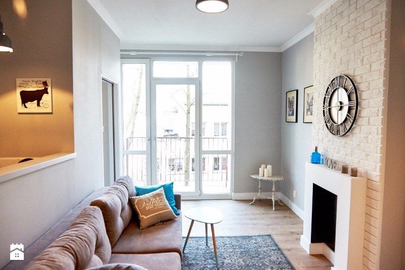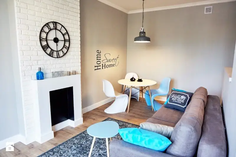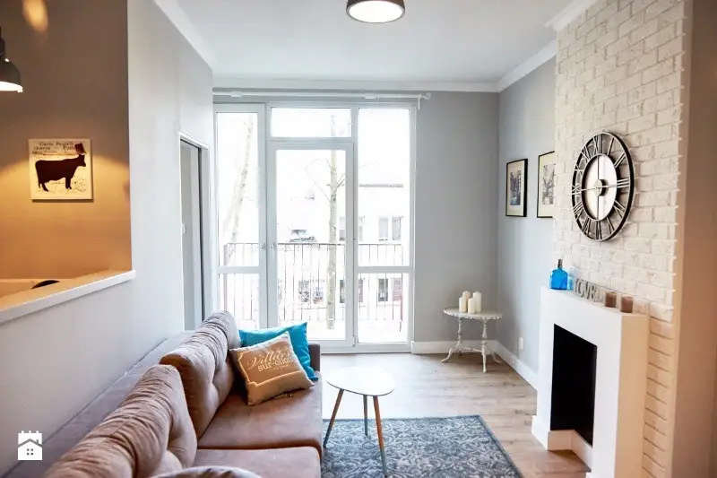 In zona de zi s-a mizat pe un decor minimalist, unde nu lipsesc piesele de accent, cum ar fi semineul fals si portiunea de perete decorata cu caramida aparenta. Adaugand canapeaua si o masuta de cafea, perne decorative si un covoras redam astfel ideea unui living armonios. Cromatica preponderent neutra cu alb si accente pastelate amplifica spatiul mic al incaperii si ii confera luminozitate.