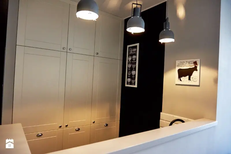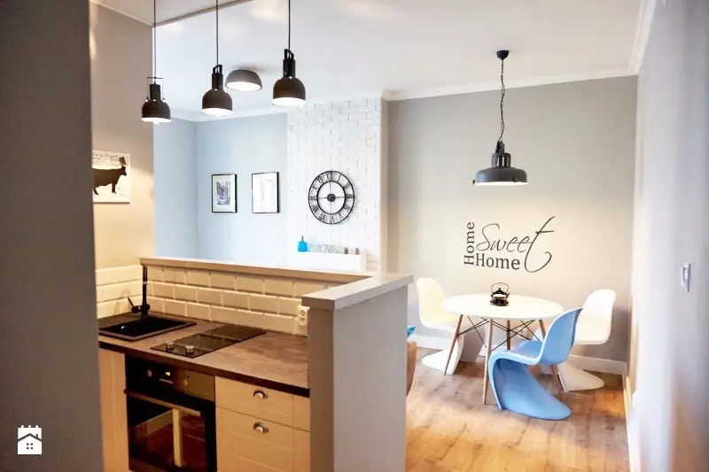 Spatiul bucatariei a fost restrans odata cu aparitia dormitorului. Acum, spatiul pentru gatit se rezuma la o chicineta cocheta amenajata in plan deschis, separata vizual de restul incaperii printr-un bar. Cele 3 corpuri de iluminat suspendate asigura o lumina directa, de accent, punand in valoare aceasta functiune.