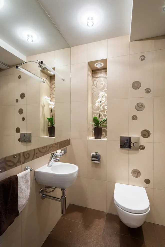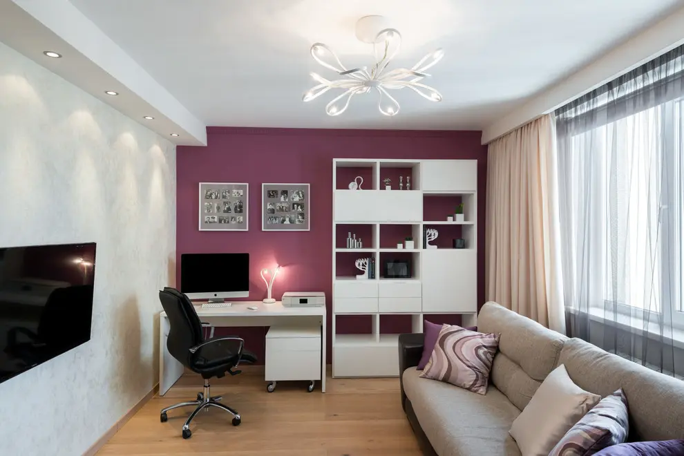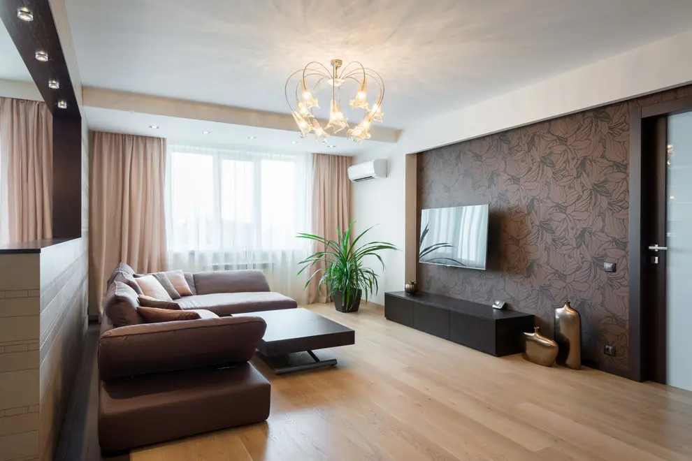 Cromatic, predomina culori calde, neutre, cu crem si bej, dar si marouri care aduc un plus de profunzime in decor. Abordarea stilistica este una minimalista, cu accent pe forme si design. Mobilarea este foarte sumara, fiind alese doar piesele cu ajutorul carora se contureaza fiecare functiune in parte. Pentru living, canapeaua, masuta de cafea si televizorul cu un corp tip consola compun spatiul destinat conversatiilor. Tapetul care decoreaza peretele cu televizorul aduce un plus de textura si culoare amenajarii. Corpul de iluminat iese in evidenta prin forma sa pretioasa. De fapt, aceasta este o trasatura ce o vom regasi de-a lungul decorului din toata casa.