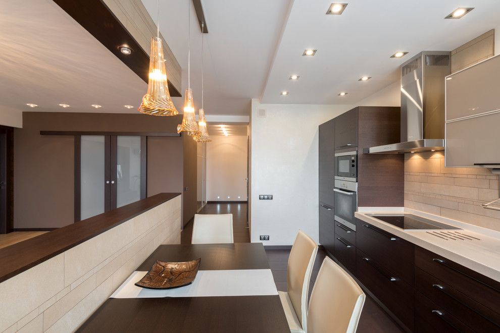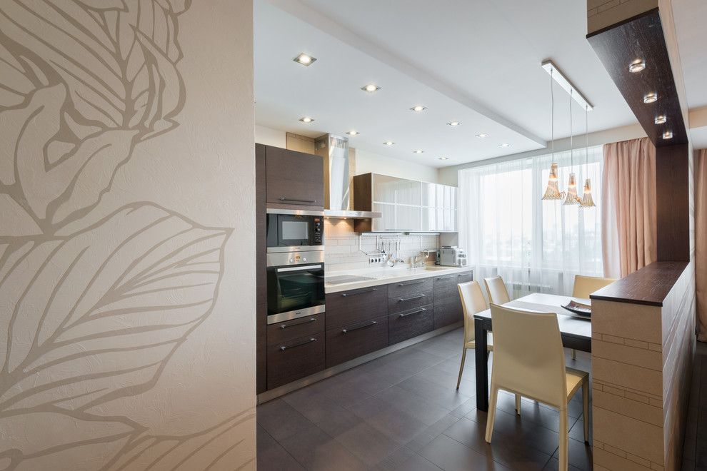 Bucataria este dispusa liniar, compact, cu toate electrocasnicele incorporate. Tot aici vom gasi si locul de luat masa, inclus in spatiul bucatariei. Cele trei corpuri de iluminat suspendate au rolul de a atrage atentia, punand in valoare acest colt al amenajarii. Mobilierul este simplu, cu un design fluent, contemporan. Atat bucataria, cat si livingul primesc o cantitate mare de lumina naturala, amplificand spatiul.