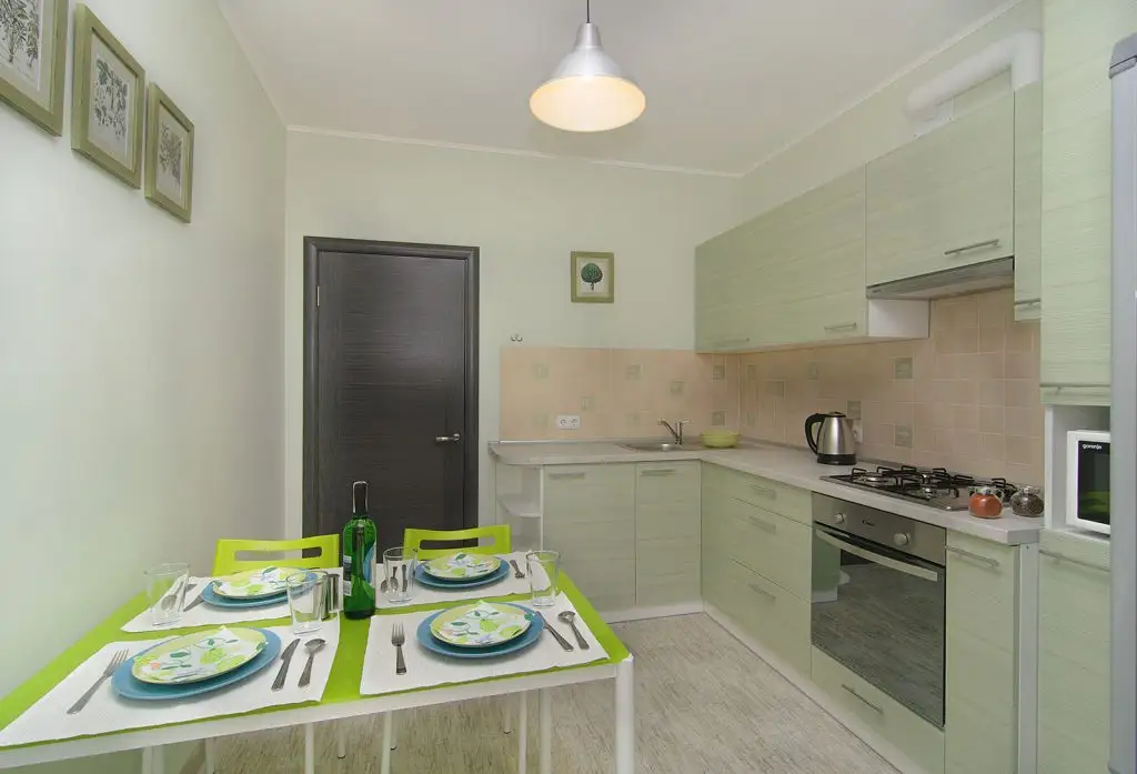 Bucataria (de aproximativ 10 metri patrati) surprinde prin minunata alegere a unui verde pastelat foarte placut pentru pereti si a unei nuante discrete adecvata pentru un mobilier de bucatarie. Alegand o forma de L pentru a configura amenajarea acestui spatiu, se castiga loc pentru masa. Iesirea spre balcon este un mare plus pentru aceasta bucatarie.