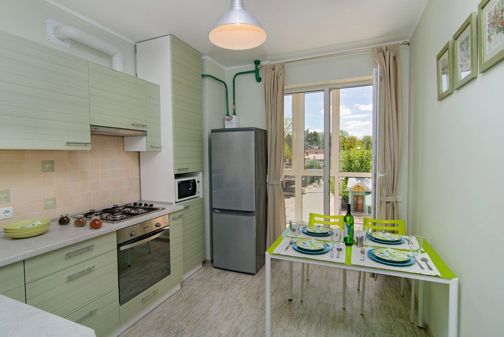 Bucataria (de aproximativ 10 metri patrati) surprinde prin minunata alegere a unui verde pastelat foarte placut pentru pereti si a unei nuante discrete adecvata pentru un mobilier de bucatarie. Alegand o forma de L pentru a configura amenajarea acestui spatiu, se castiga loc pentru masa. Iesirea spre balcon este un mare plus pentru aceasta bucatarie.