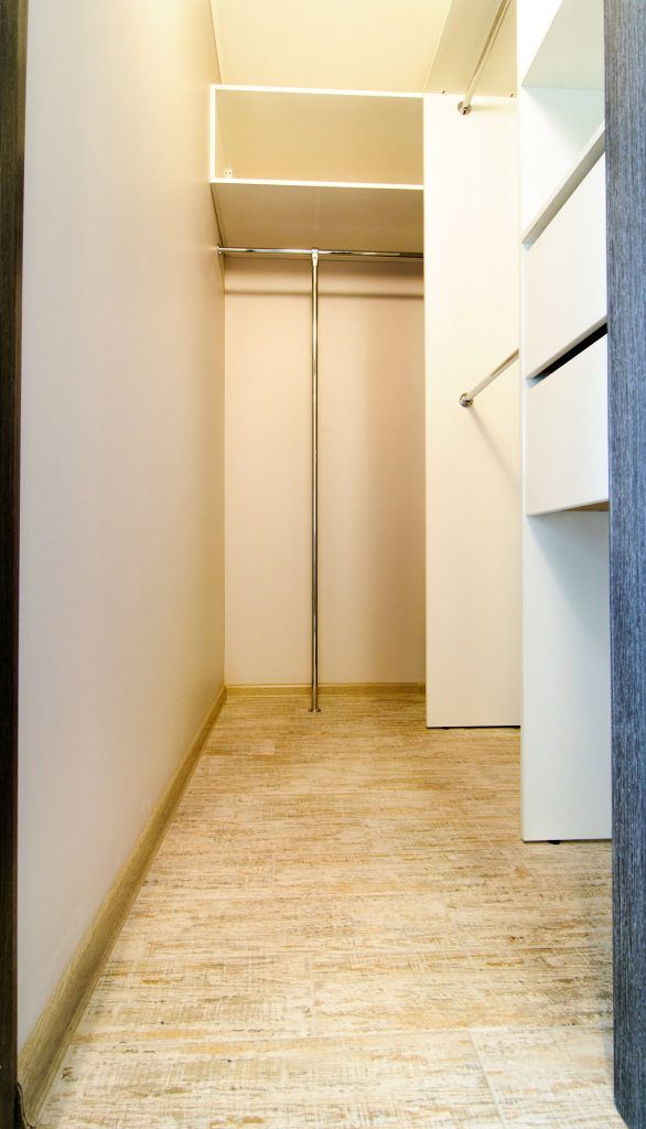 Baia ofera un aspect corect, cu elemente neutre adaptate spatiului. In hol, camara a fost transformata intr-un dressing pentru a asigura necesarul de depozitare al familiei.