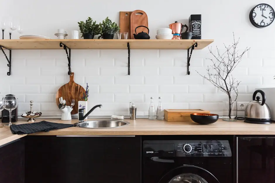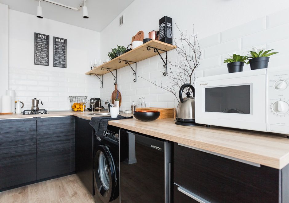 Pentru spatiul din bucatarie, s-a mizat pe o abordare dramatica – mobilier negru. Contrastul alb-negru aduce un plus de eleganta amenajarii, iar lemnul de la nivelul pardoselii si al blatului de lucru incalzeste atmosfera.