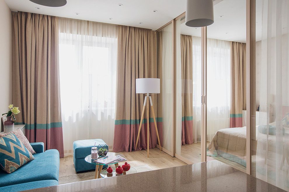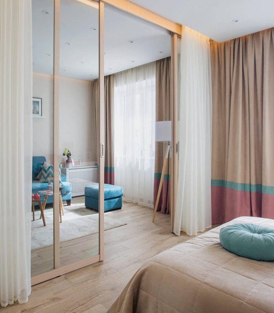 Zona de zi cuprinde bucataria si livingul, iar pentru dormitor, designerul a mizat pe o abordare simpla cu usi glisantecare functioneaza ca partitie intre cele doua functiuni. Usile sunt din sticla astfel ca intreaga camera pare mai spatioasa. Pentru un plus de intimitate, dormitorul a fost prevazut cu perdele in dreptul usilor.