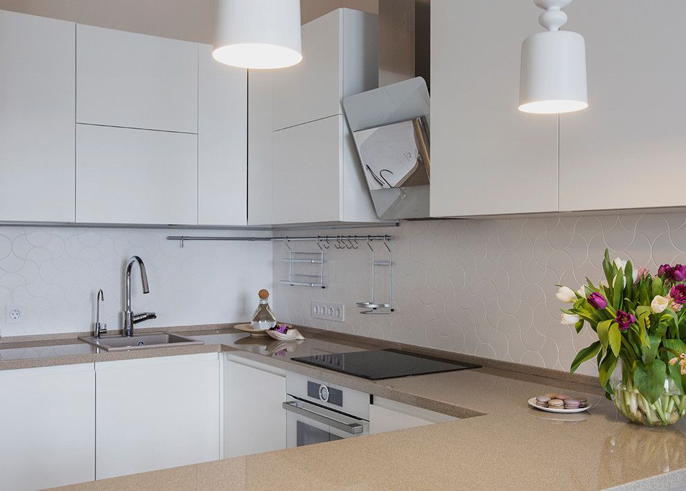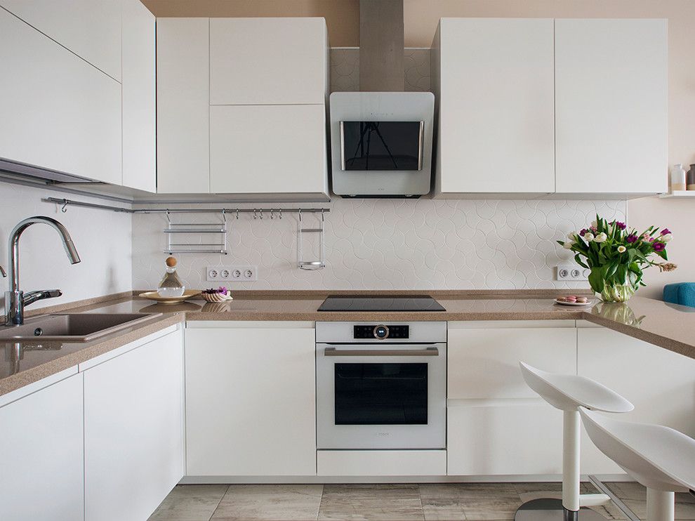 Bucataria in plan deschis asigura toate cele necesare pentru a gati si depozita. Este dispusa in forma de L, cu electrocasnice incorporate si o dispunere optima a zonelor de lucru. Mobilarea este simpla, cu front alb si manere frezate pentru a pastra cat mai luminoasa si unitara aceasta zona a locuintei. Blatul de lucru se prelungeste, formand o a treia latura a bucatariei, folosita ca loc de luat masa.