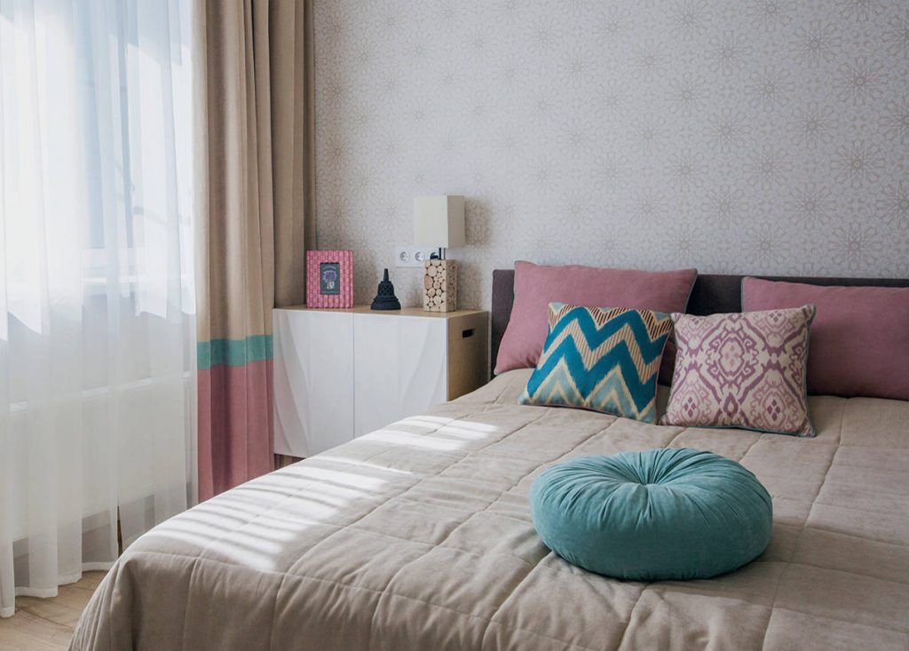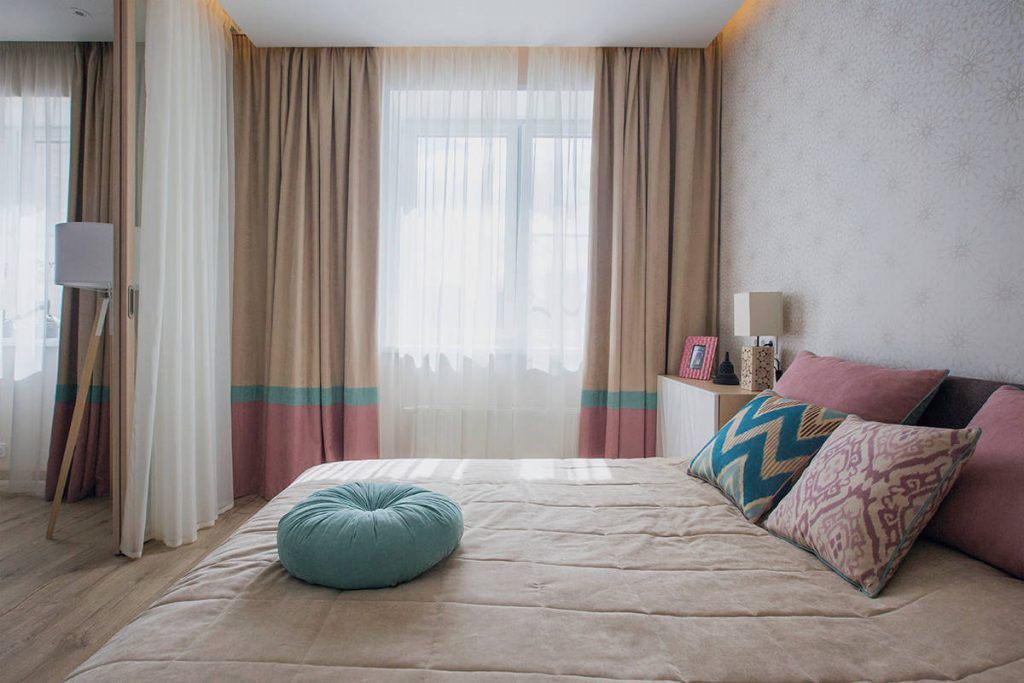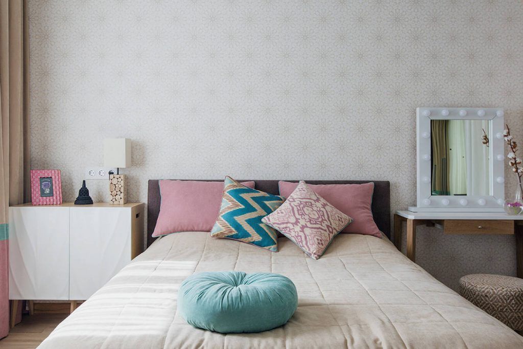 Dormitorul este gandit ca o zona de relaxare, cu paleta cromatica preluata din restul amenajarii. Se pastreaza acelasi tip de draperii din living pentru a sublinia ideea de continuitate intre cele functiuni. Pentru o optimizare a incaperii, noptierele au fost inlocuite cu o comoda de o parte si o masuta pentru machiaj de cealalta parte. Intr-o nisa a fost amenajat un dressing generos, ce poate fi ascuns tot cu ajutorul unor perdele. Imprimeul discret al tapetului completeaza placut ambientul dormitorului.