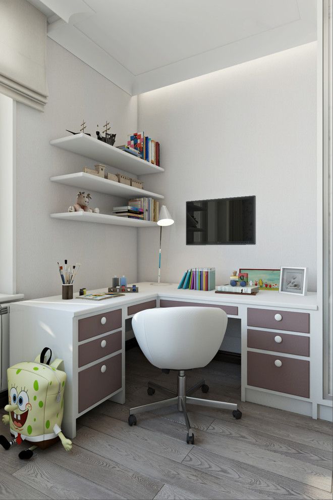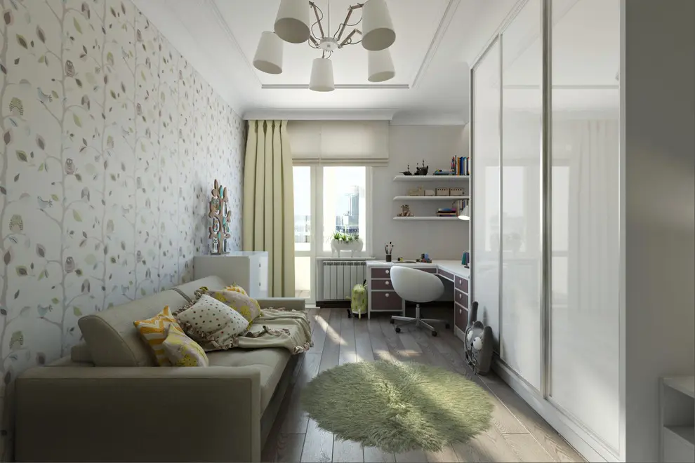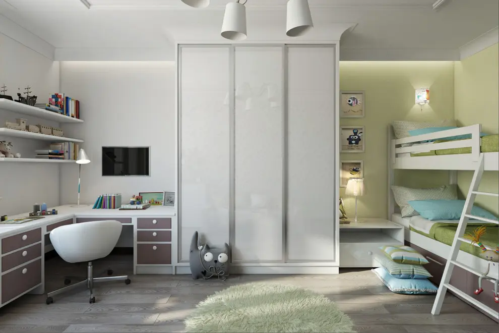 Camera copiilor este amenajata cu cele necesare, de la paturi si birou, pana la canapea si dulap generos pentru o depozitare variata. Culorile sunt vesele potrivite unei camere de copii, cu accente de verde deschis si un tapet cu imprimeu jucaus.