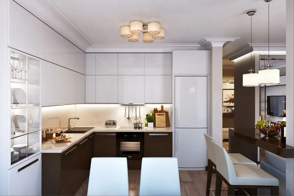 Bucataria a fost gandita cu o configuratie in forma literei L pentru a maximiza spatiul disponibil. La nivelul mobilierului predomina albul pentru a amplifica spatiul si a-i spori luminozitatea. Pentru corpurile principale s-a ales un maro-brun care echilibreaza cromatic decorul.