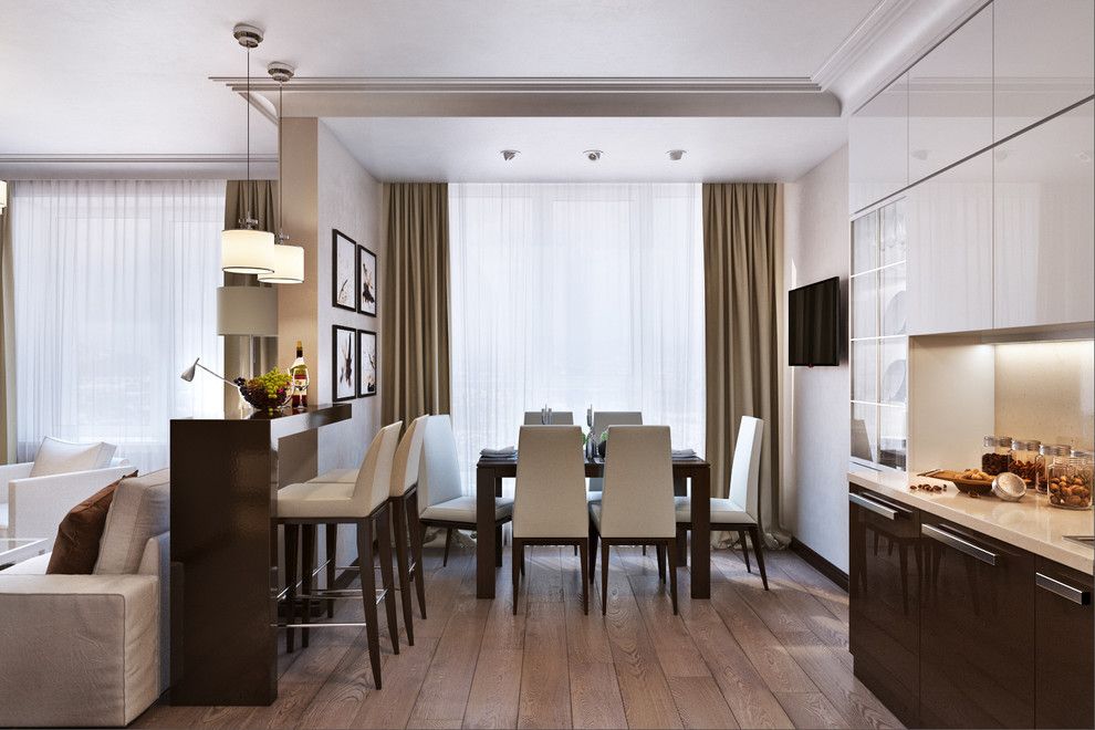 Trecerea spre dining si bucatarie se realizeaza subtil prin barul amenajat in spatele canapelei. Spatiul de la fereastra a fost destinat mesei, amenajat ca un adevarat dining formal. Piesele alese compun o zona eleganta, cu multa lumina naturala.