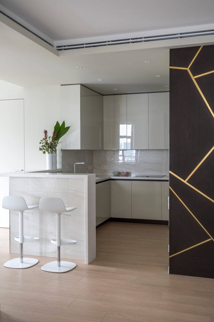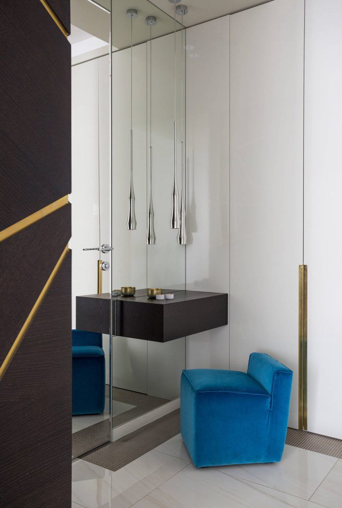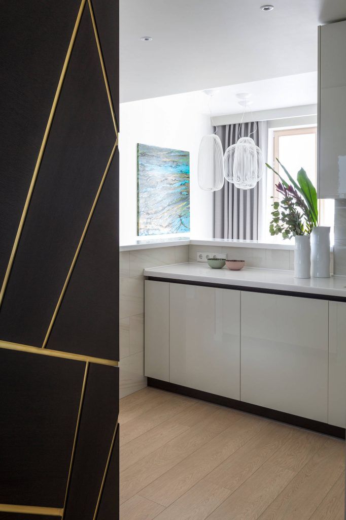 Ne-am jucat cu texturi, adaugand oglinzi si suprafete lucioase care creeaza multiple reflexii. Fatadele mobilierului de bucatarie au o suprafata lacuita, iar insertiile de alama in usile dulapului si pe panourile decorative subliniaza jocul geometric.
