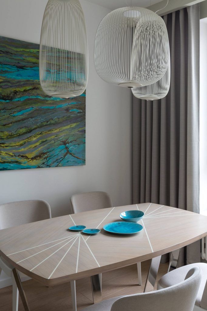 Pentru ca schema de culori sa nu para prea monotona (tonuri neutre, nuante de alb), designerii au folosit ca si culoare accent albastrul, care este si culoarea preferata a proprietarilor, dar si texturi si forme ce se regasesc in draperii, pereti si tablouri.