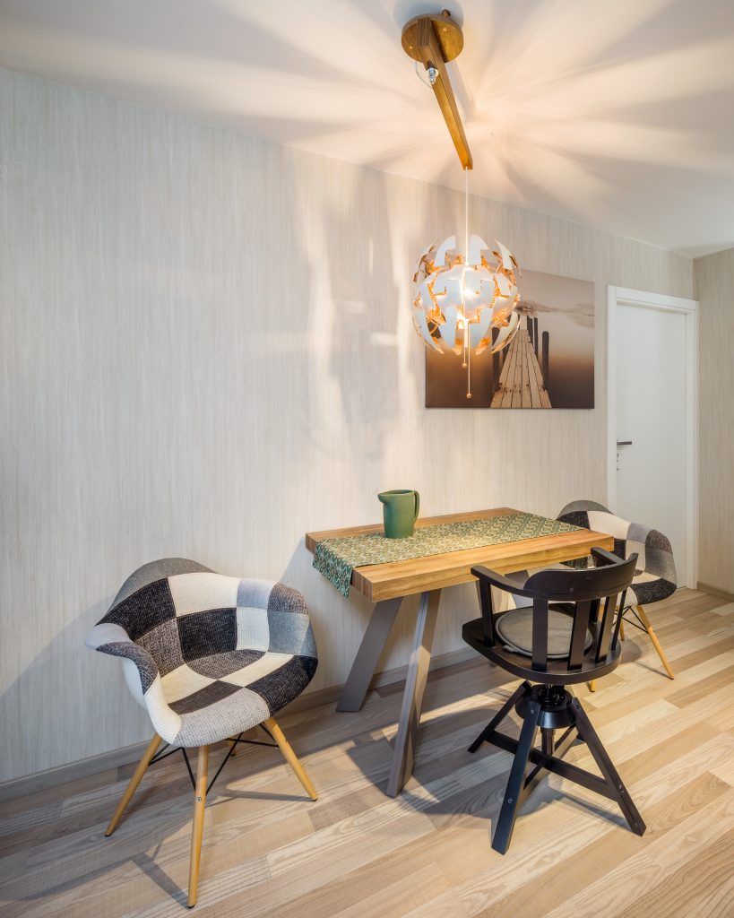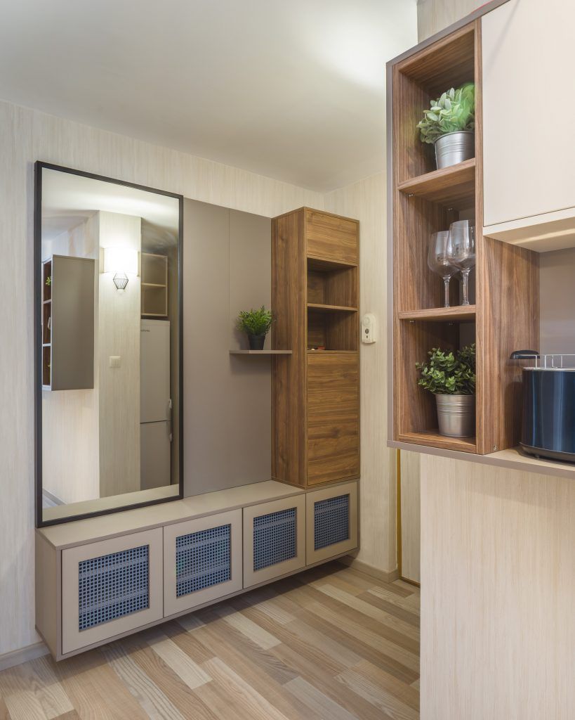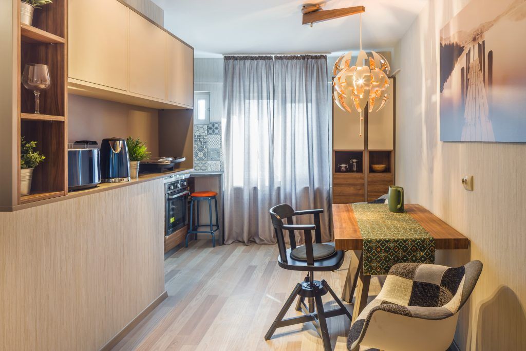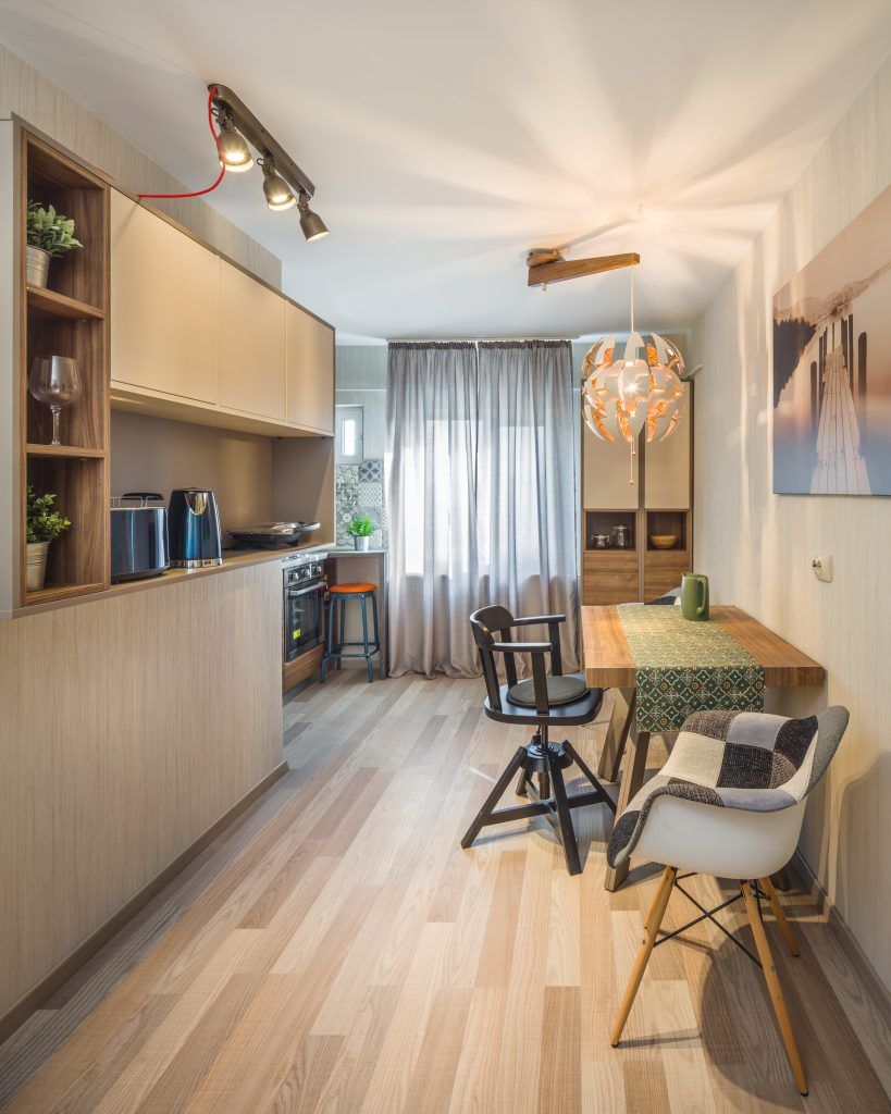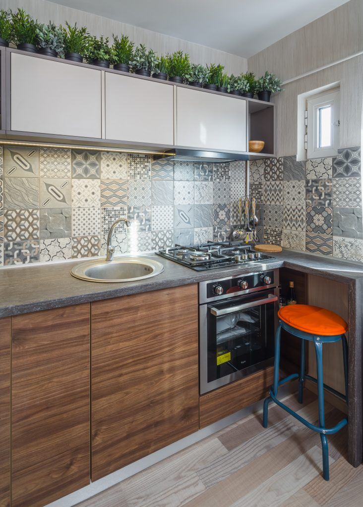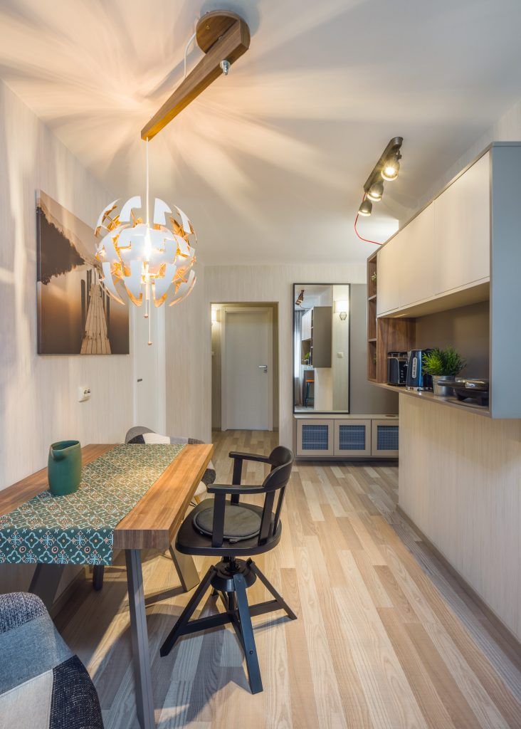 Pentru a eficientiza spatiul, zona de la intrare a fost deschisa catre bucatarie. Aici s-au pozitionat un pantofar, un cuier, frigiderul si un mic loc de depozitare. Mergand inspre bucatarie descoperim un spatiu cu personalitate conturat dupa dorintele celor doi beneficiari. Pe langa zona de gatit si spatiul de luat masa, s-a dorit integrarea a unui dulap suspendat ce functioneaza pe post de bar. Forma atipica a corpurilor de mobilier precum si placile ceramice cu model patchwork dinamizeaza decorul si ii ofera personalitate.