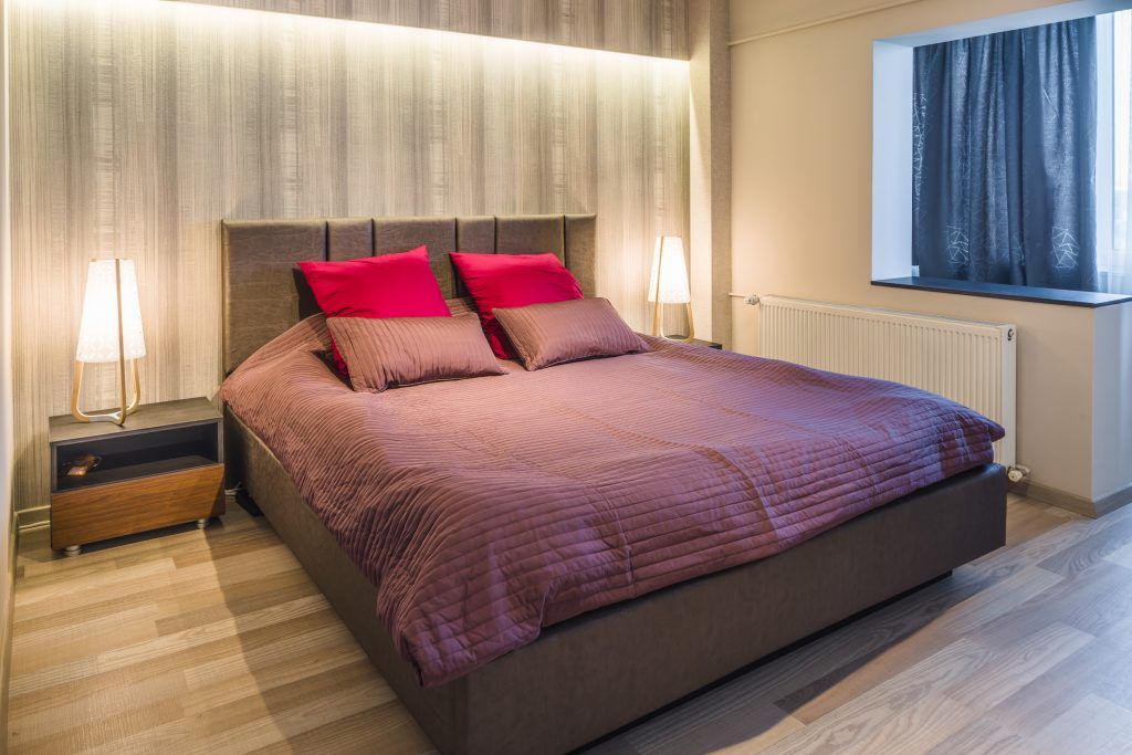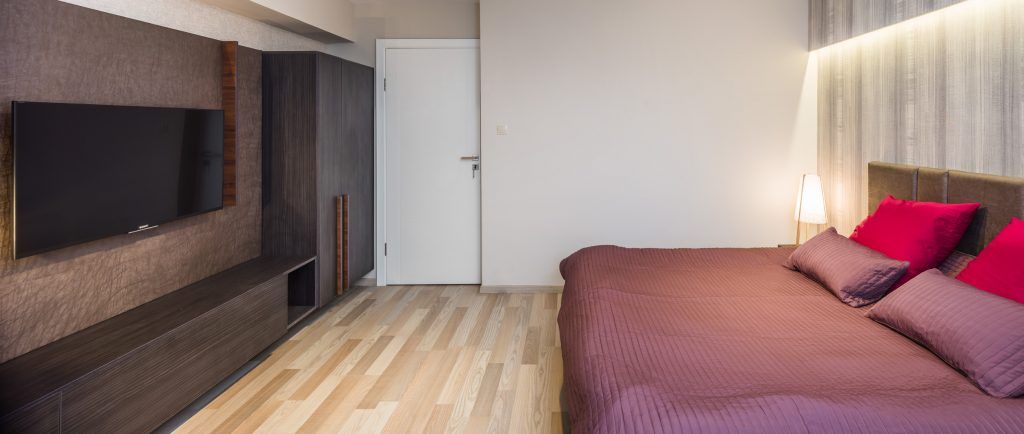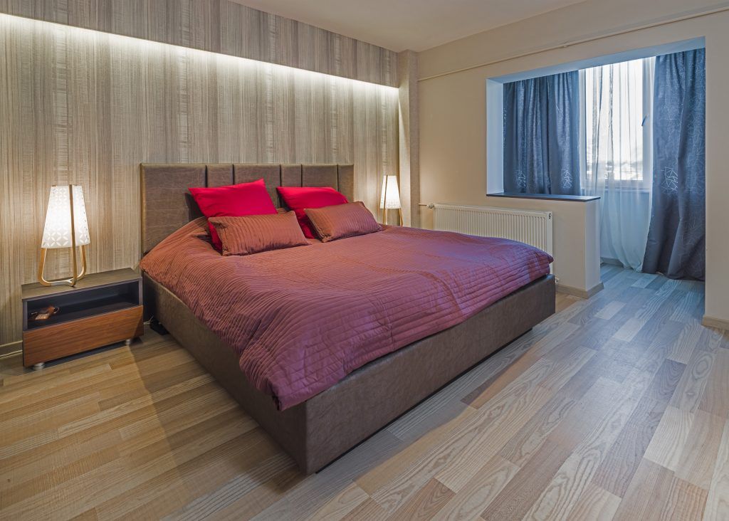 Dormitorul surprinde prin eleganta si caracterul usor glamour. Tapetul din spatele patului precum si scenariul corpurilor de iluminat contureaza un spatiu relaxant si confortabil. Acelasi tip de pardoseala din parchet laminat de la Tarkett, o intalnim si in dormitor, oferind un caracter unitar diferitelor functiuni ale casei. Balconul este folosit ca spatiu de machiaj. In baie, s-a mers pe finisaje cu tonuri neutre pentru un ambient confortabil si placut.