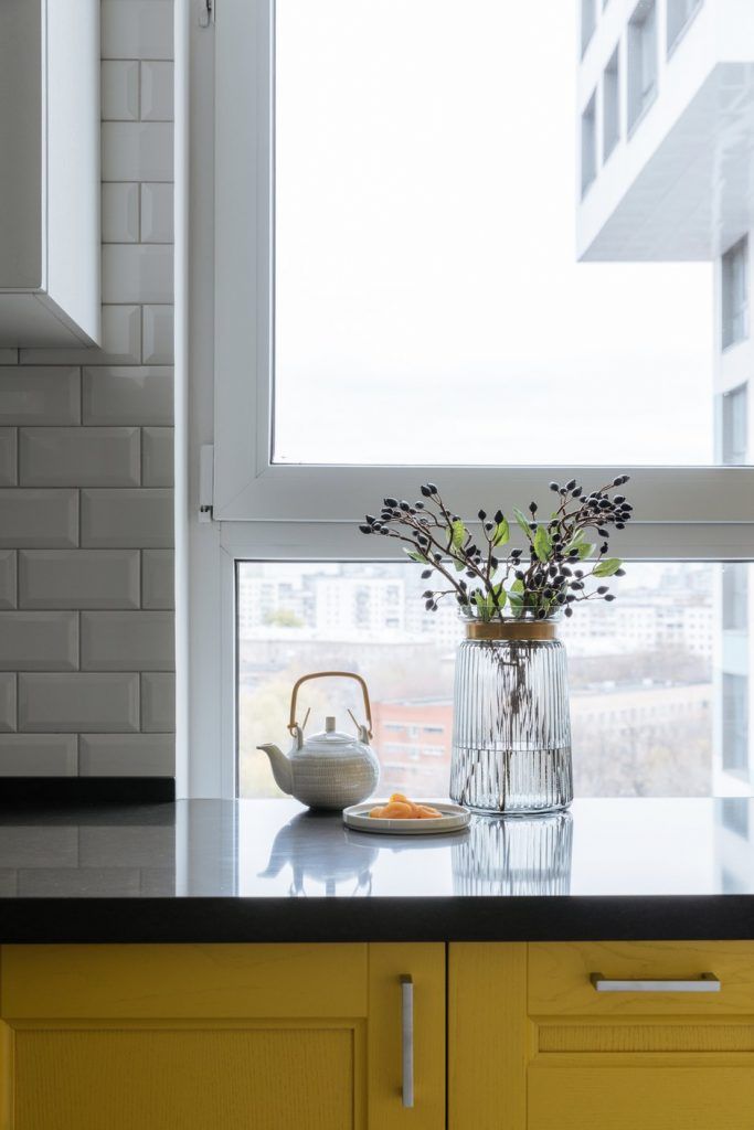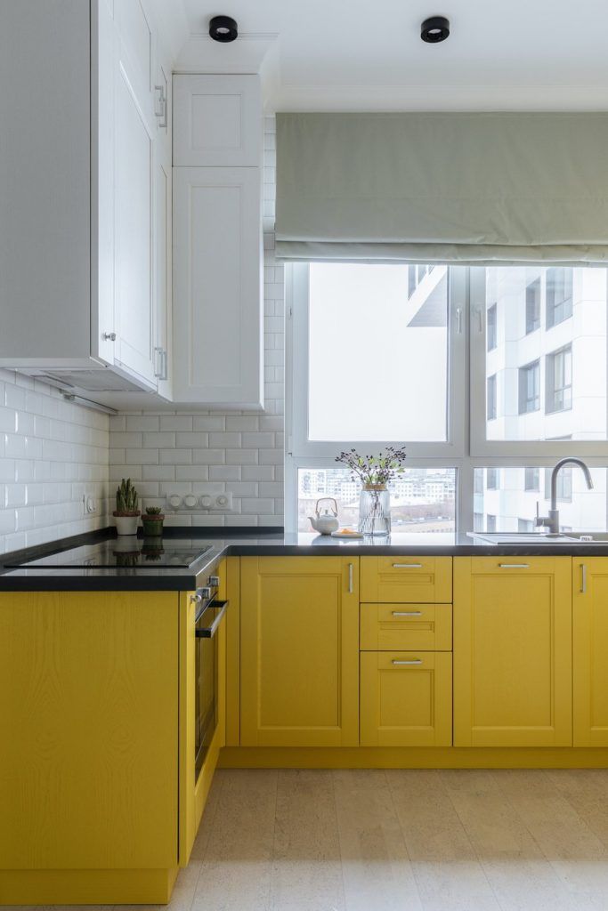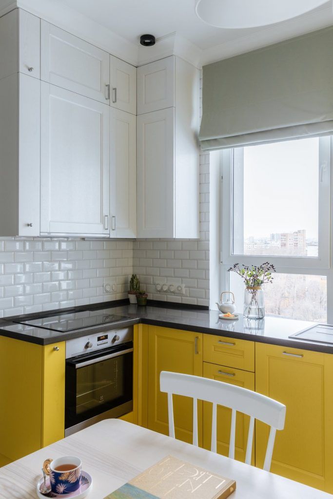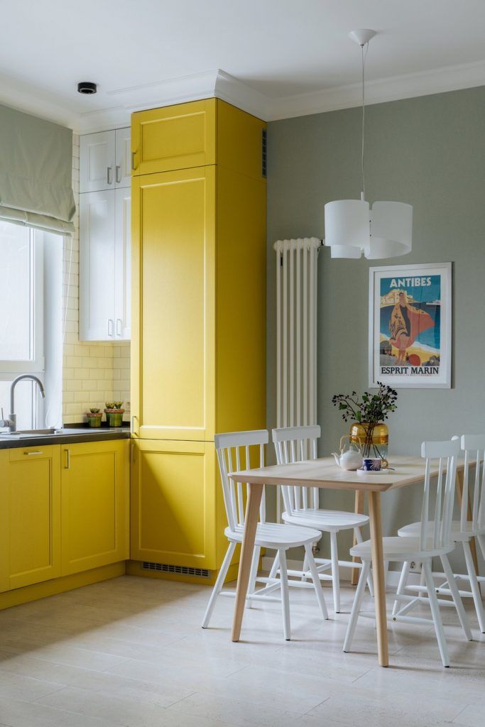 Bucataria este plasata langa geam si se bucura din plin de lumina naturala. Aceasta a fost gandita ca o zona compacta, unitara, cu mobilierul dispus in forma literei U. Electrocasnicele au fost incastrate, inclusiv frigiderul. Datorita combinatiei dintre galben si alb, aceasta are un aer proaspat si nu pare incarcata.