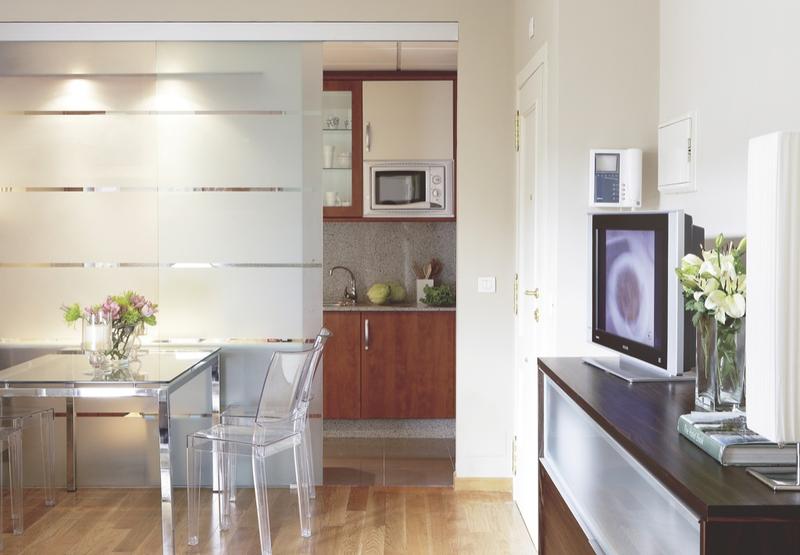 Bucataria ar fi putut fi una in plan deschis, insa pentru a tine mirosurile la distanta, s-a optat pentru un perete despartitor din sticla securizata cu o usa glisanta. Imediat langa acest perete, a fost amenajat un discret loc de luat masa. Scaunele transparente si masa cu picioare cromate si blat din sticla reflecta orice forma de lumina si lasa impresia ca acest loc pluteste in spatiu.
