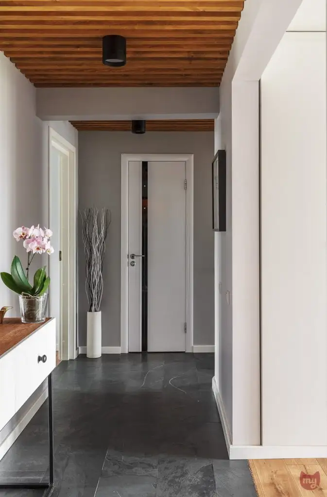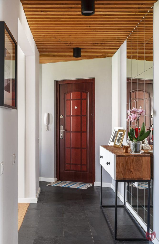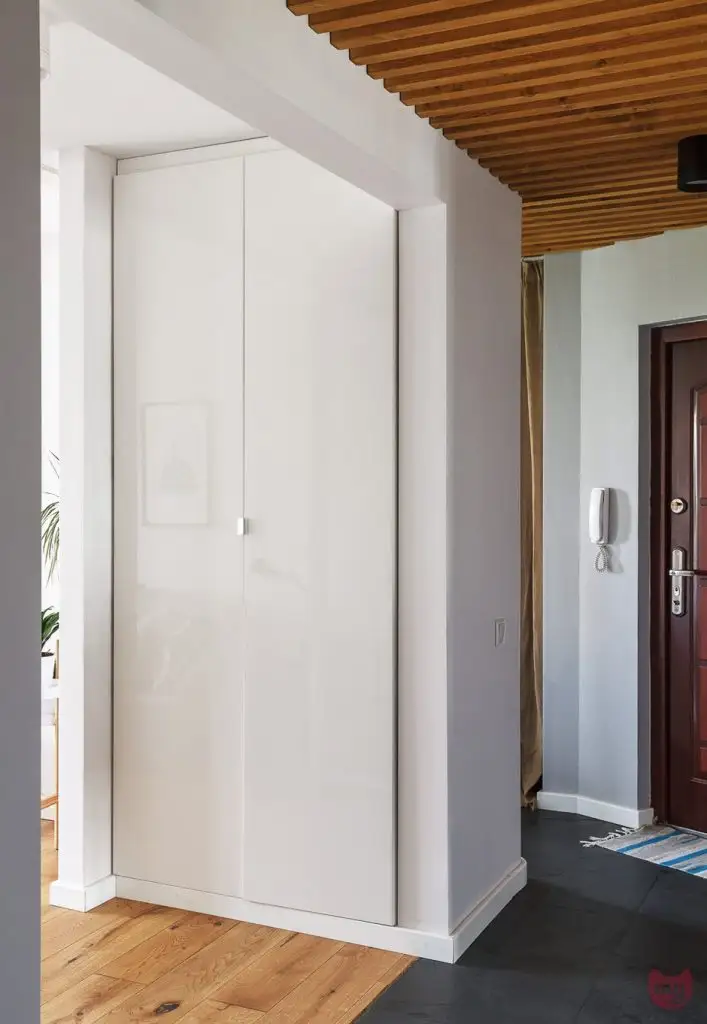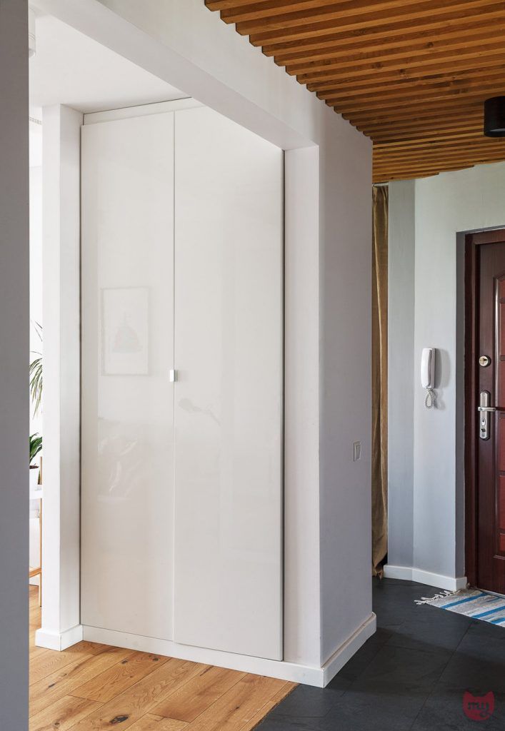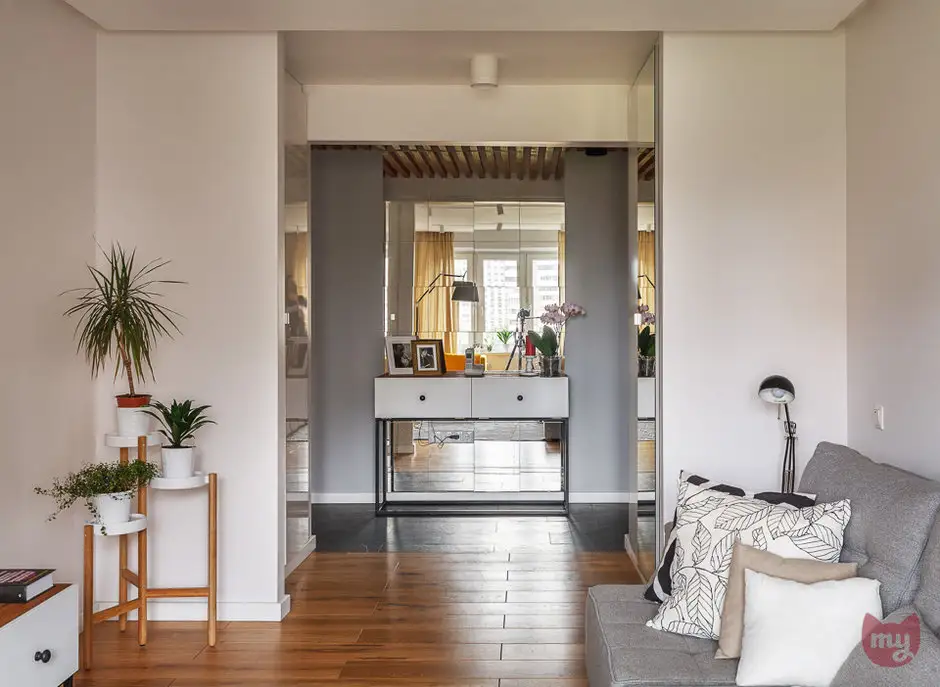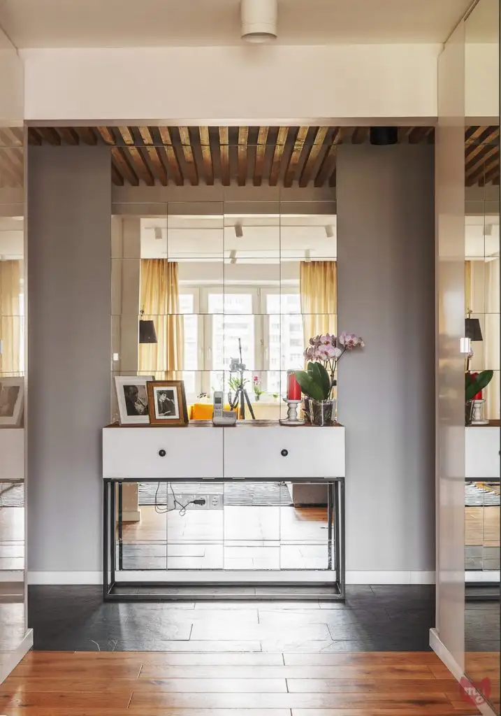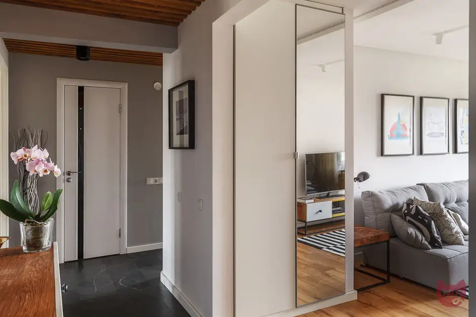 Deschiderea livingului inspre hol a permis ca de o parte si cealalta a peretilor sa fie amenajate 2 dulapuri inalte incastrate in 2 nise special create pentru a spori capacitatea de depozitare. Jocul oglinzilor, atat ale dulapurilor cat si mozaicul creat in zona de trecere a holului contribuie la marirea spatiului si reflectand lumina.