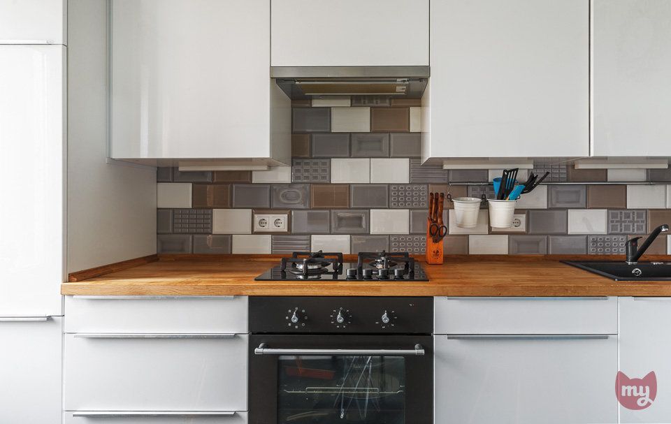 Interesante sunt placile usor tridimensionate care contureaza o zona de accent intre spatiul dintre corpurile de mobilier. Gresia ce imita aspectul granitului o vom regasi atat in bucatarie cat si in hol.