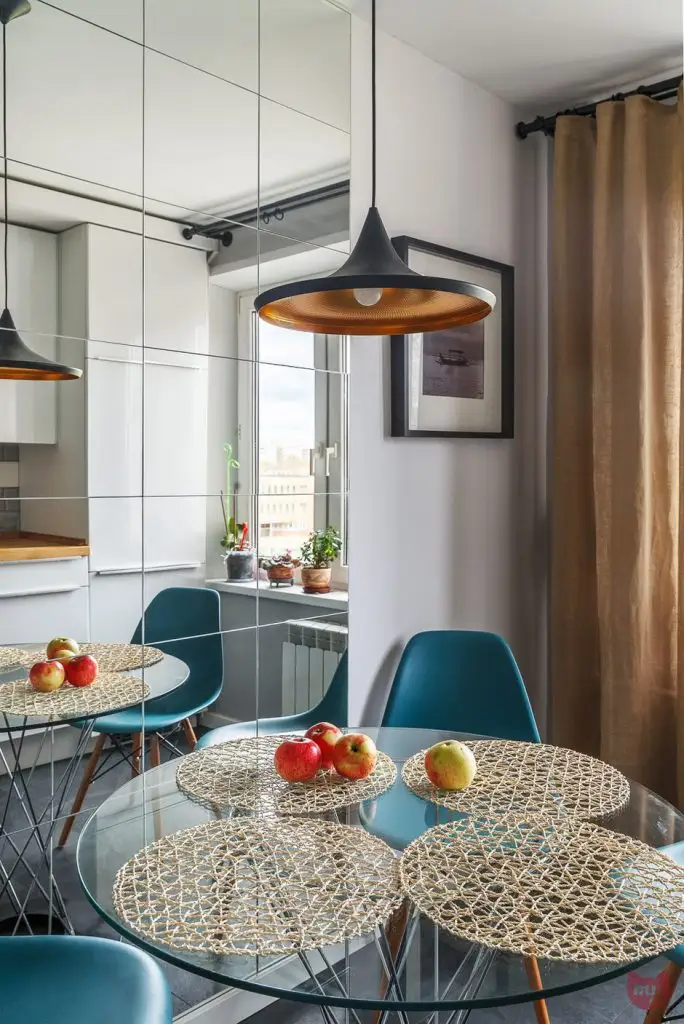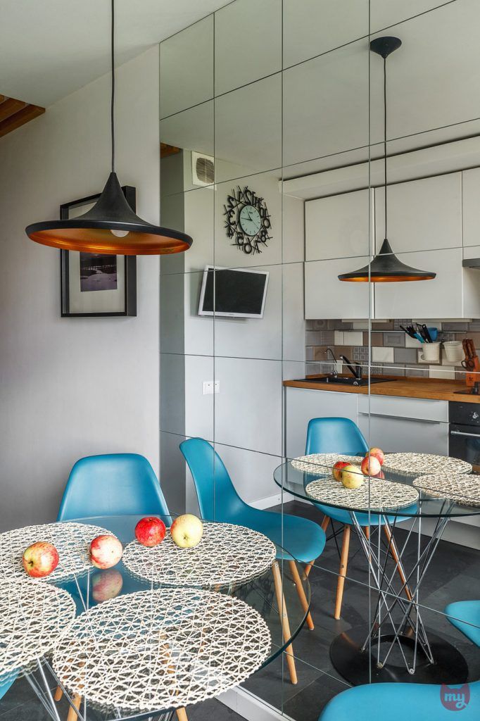O abordare similara intalnim si in bucatarie, un spatiu mic si compact amenajat insa cu gust. Trucul oglinzilor pozitionate in dreptul locului de luat masa ofera o senzatie de spatialitate atat de necesara in contextul bucatariei. Mobilierul este alb, cu blat de lucru din lemn si electrocasnice incorporate pentru a spori caracterul unitar al decorului.