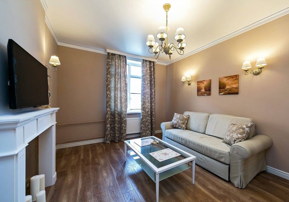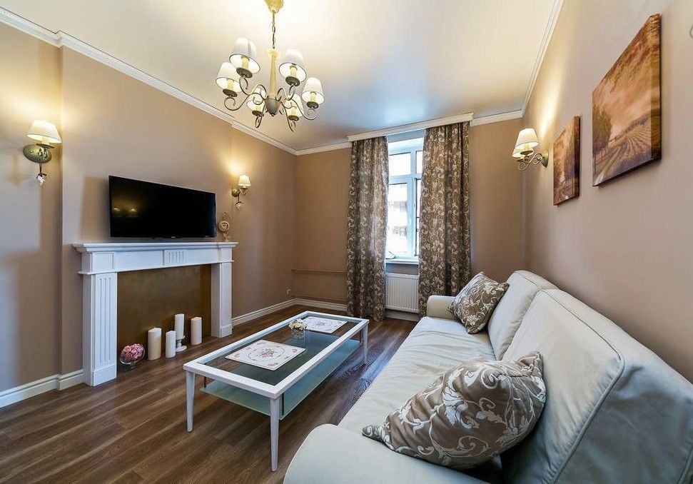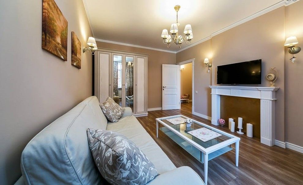 Living-ul se compune dintr-o canapea pozitionata central, un dressing in linii retro, o masa de cafea din sticla si un semineu improvizat, punct de interes al design-ului tipic american. Nuantele predominante sunt pastelurile, griul si auriul, iar pattern-ul draperiei si design-ul corpurilor de iluminat ajuta la accentuarea stilului vintage.