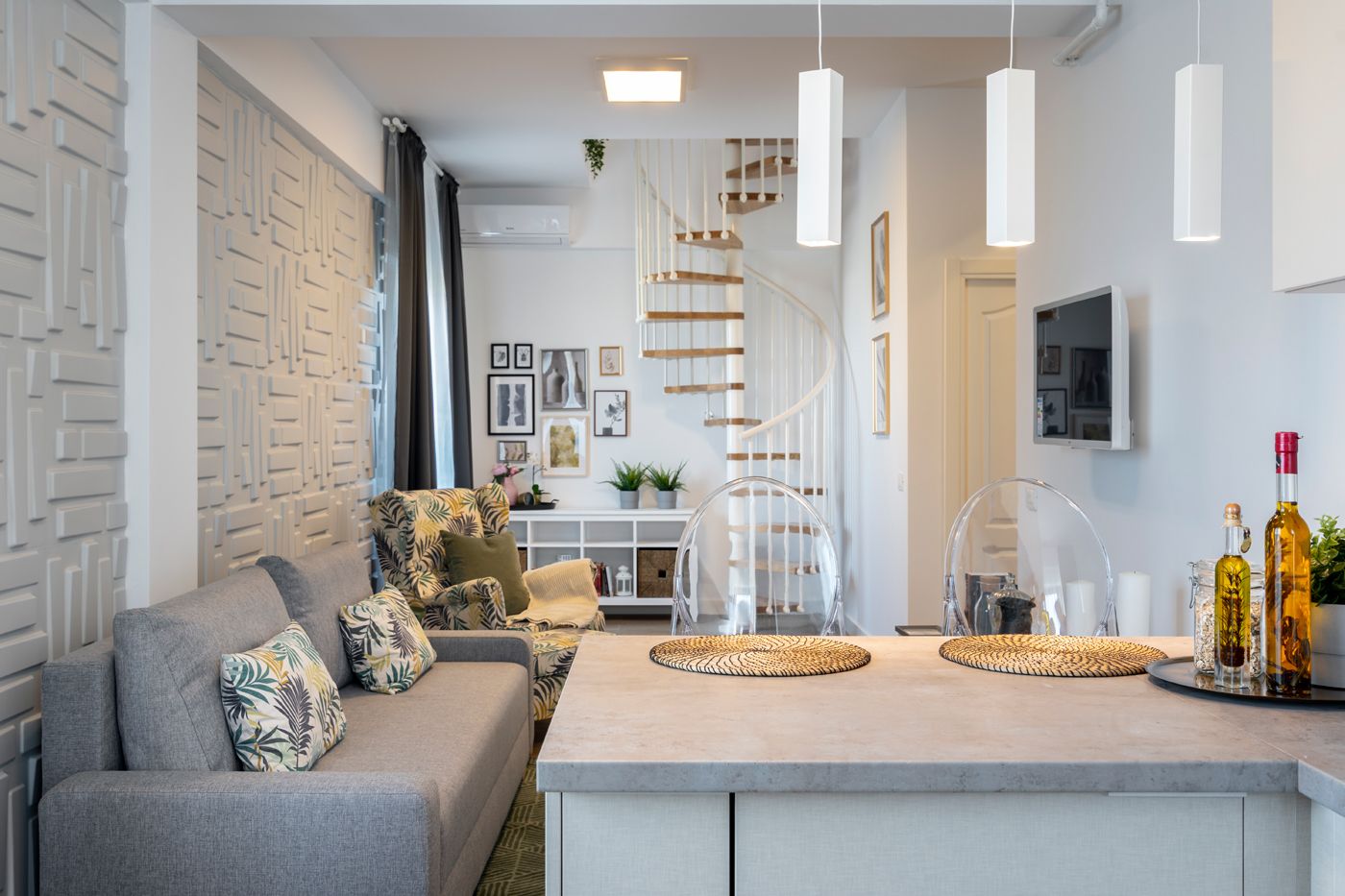 Profitand de absenta partitiilor structurale, designerul de interior Claudia Luchenko, impreuna cu beneficiarul, a decis sa nu separe zona de living de bucatarie, pentru a crea un spatiu amplu, in care diferitele zone comunica eficient. Rezultatul este un open-space unitar si comfortabil, pentru toate activitatile preferate ale clientului (zona de gatit, primire oaspeti, un fotoliu comod in bucatarie pentru citit seara si relaxare, un living primitor ).