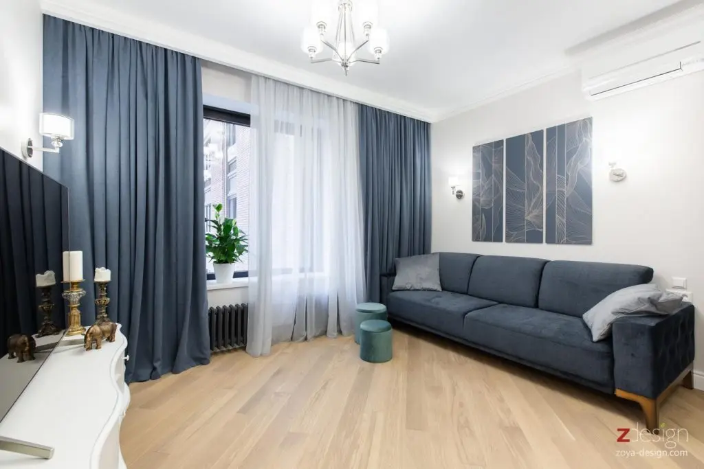 In living, designerii de la Zdesign, au ales o canapea extensibila pe care au asortat-o atat cu draperiile si tabloul abstract de deasupra, cat si cu tapiteria scaunelor din zona de dining.